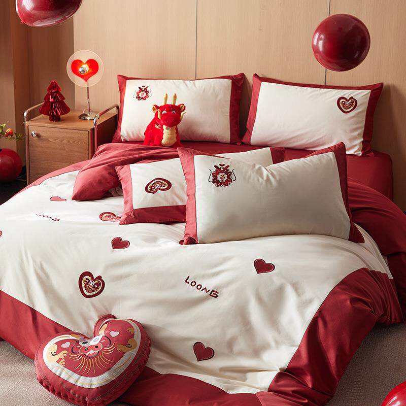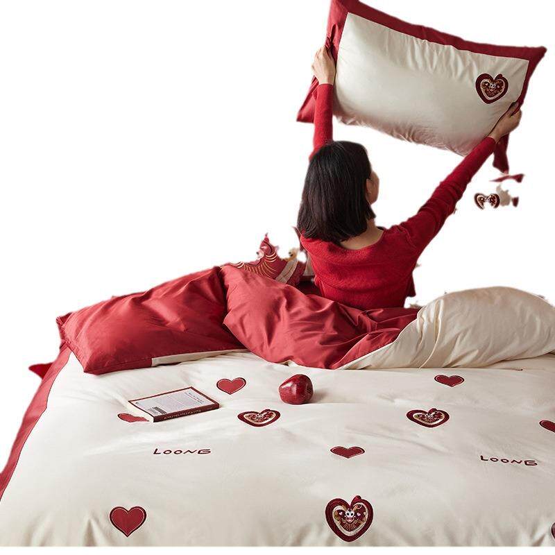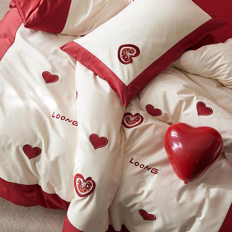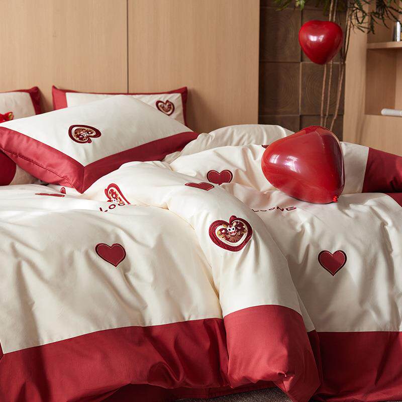 婚庆红色爱心100S贡缎长绒棉结婚四件套纯棉全棉床单被套床上用品
