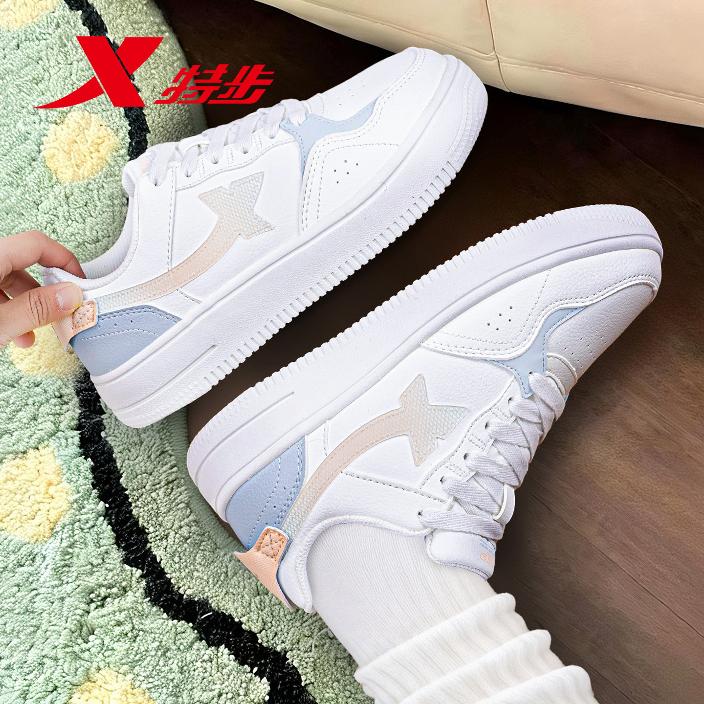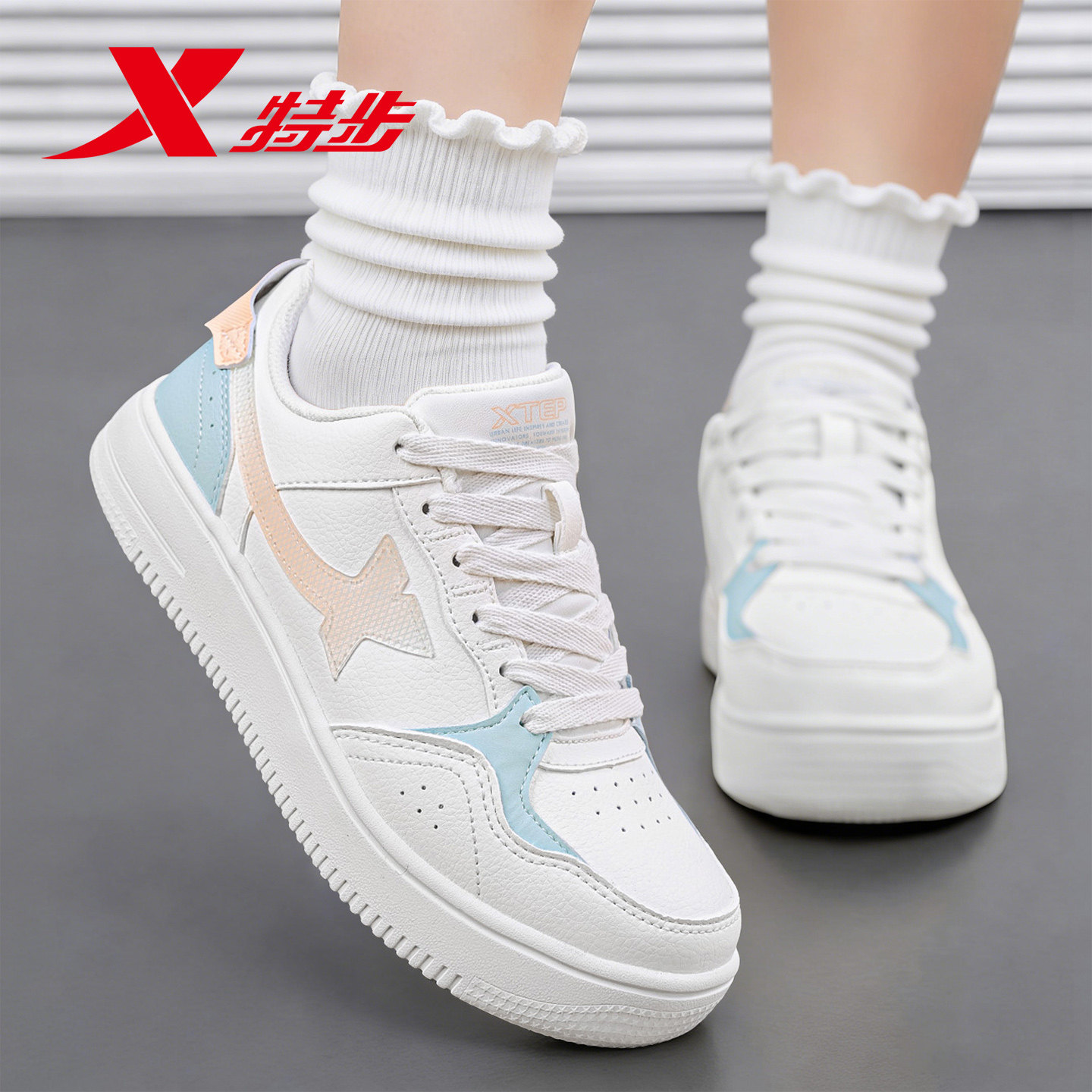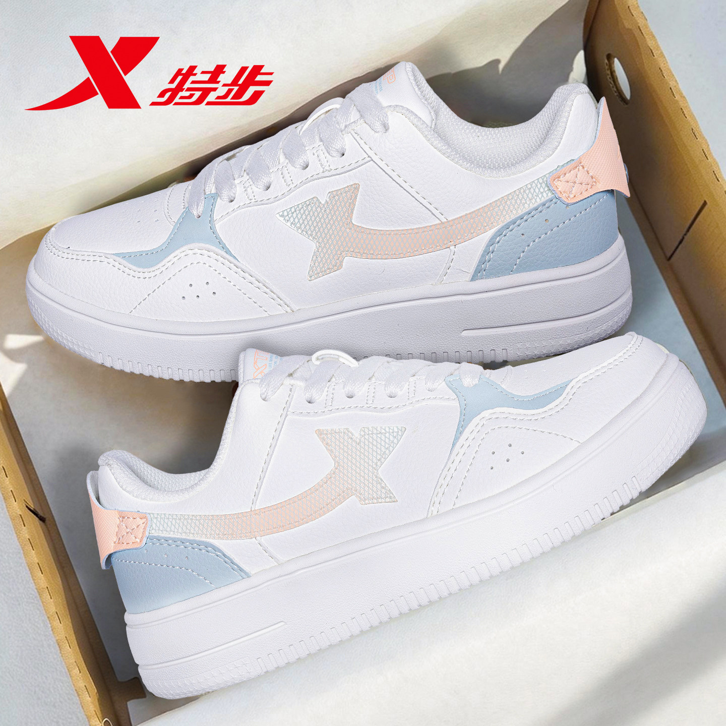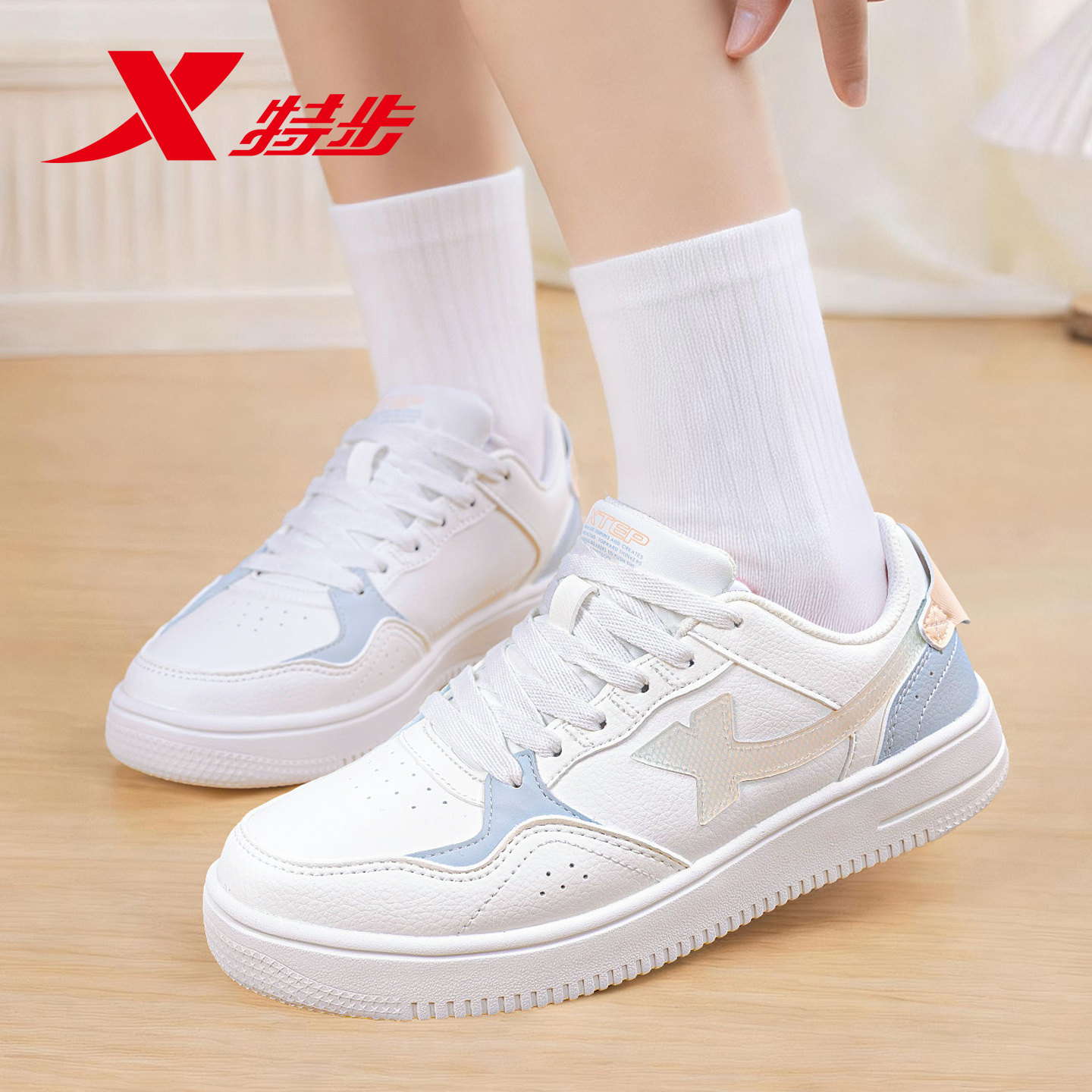 特步板鞋女鞋2026新款春季白色皮面小白鞋子女款学生休闲鞋运动鞋