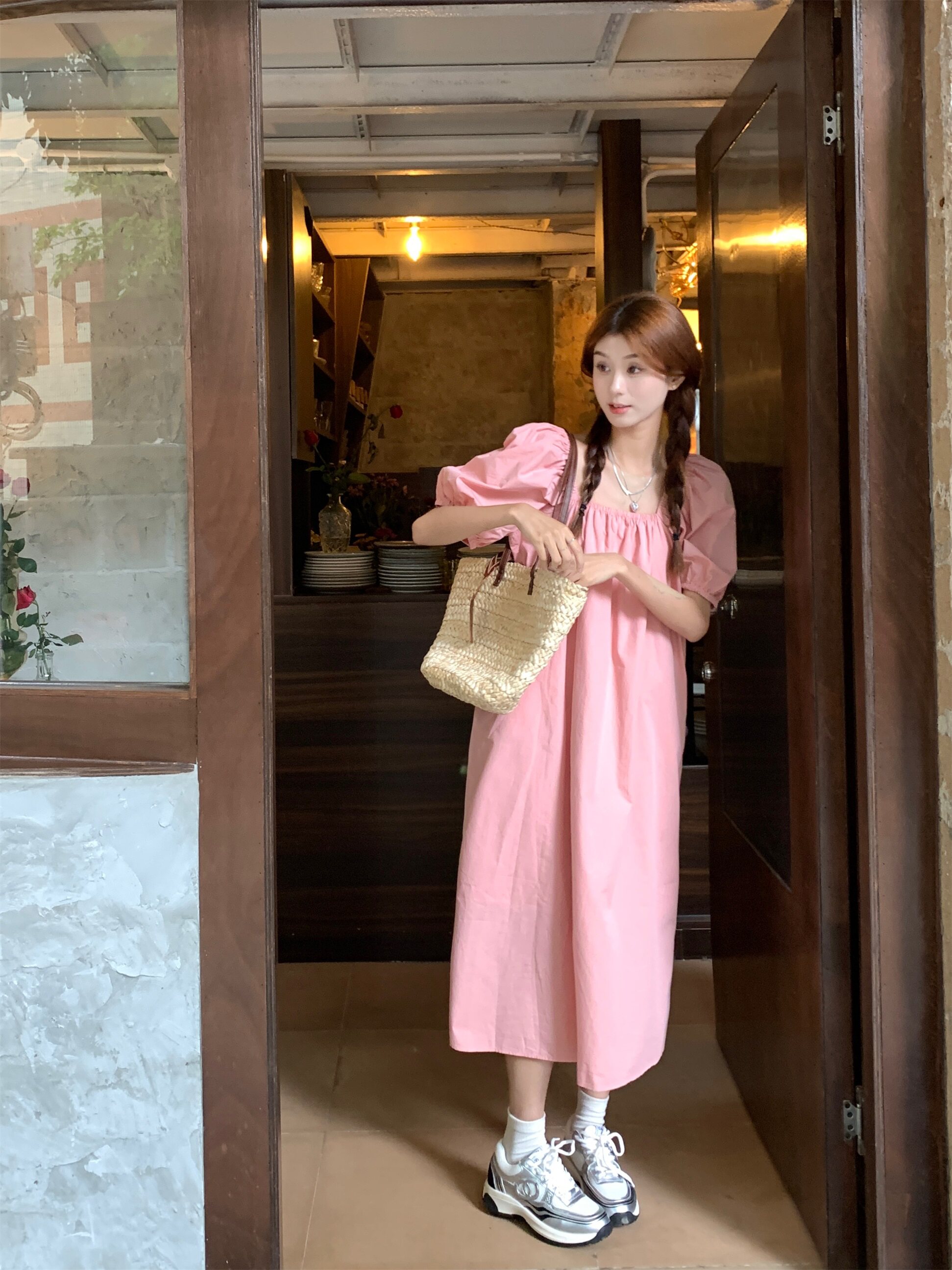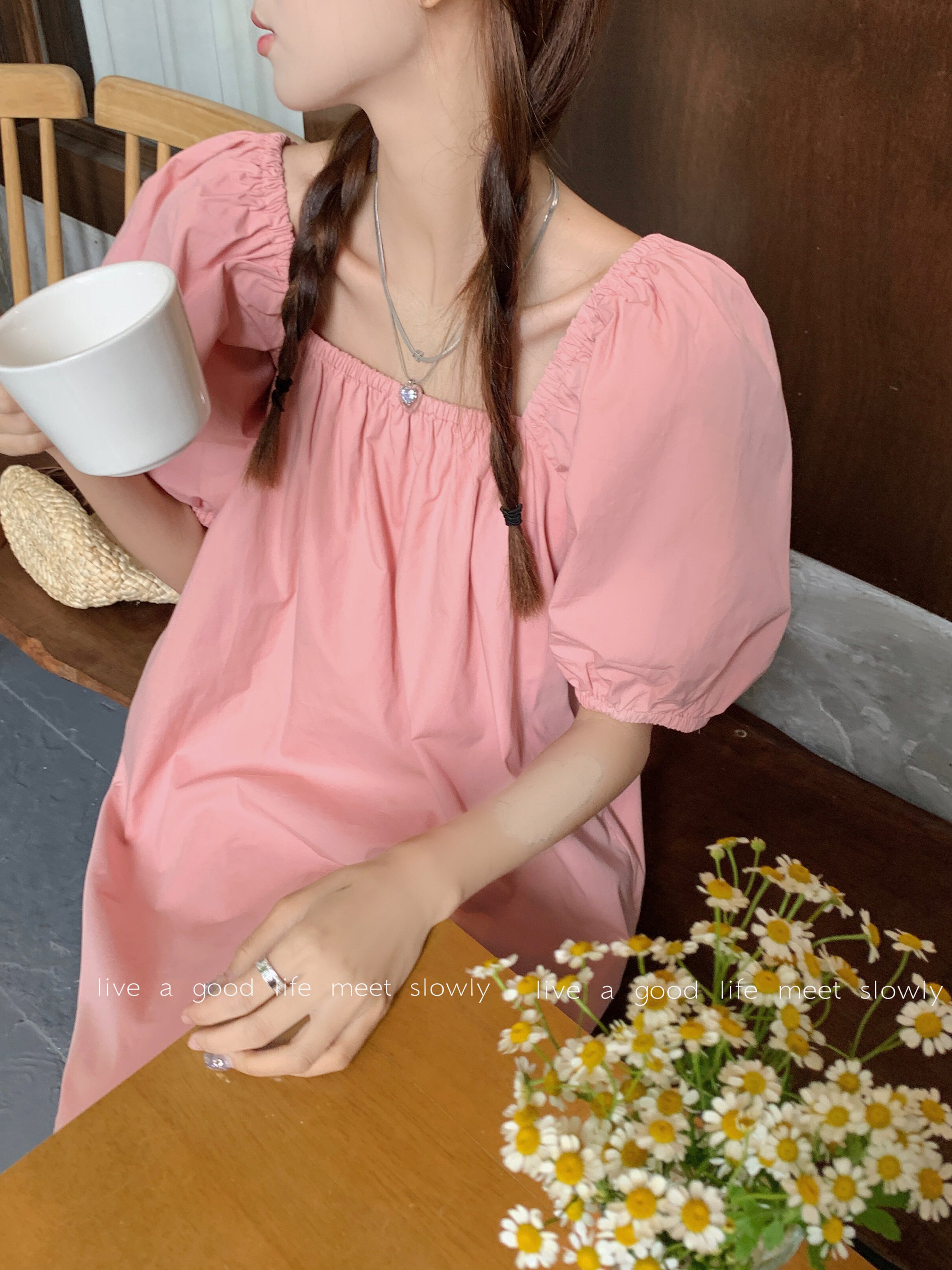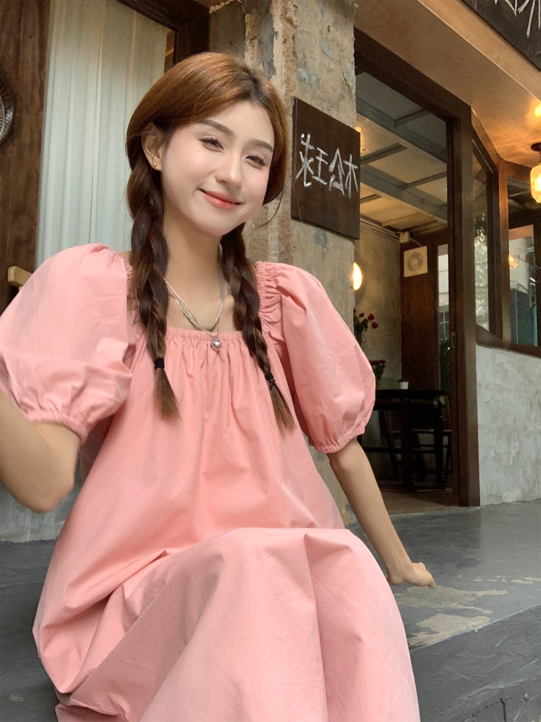 韩系温柔风泡泡袖粉色连衣裙女夏季宽松显瘦气质高级感小个子长裙