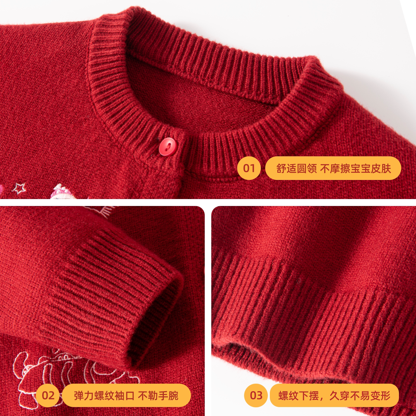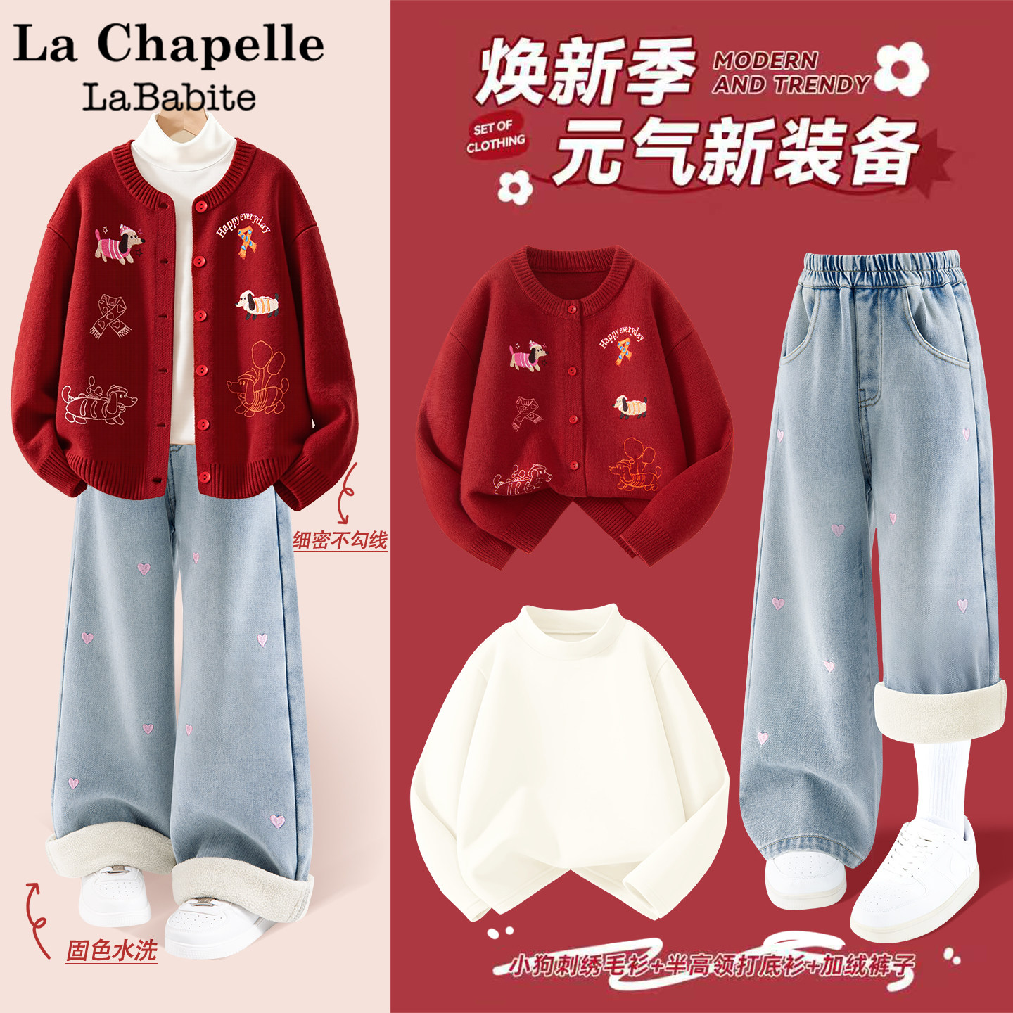 拉夏贝尔女童冬装套装2026新年儿童红色毛衣加绒牛仔裤女孩三件套