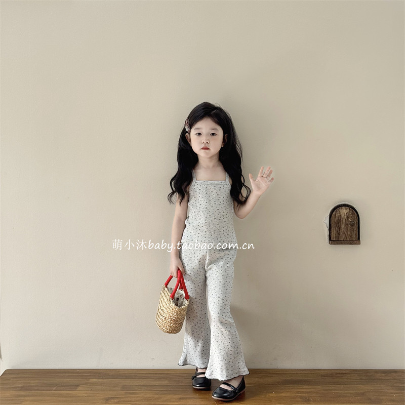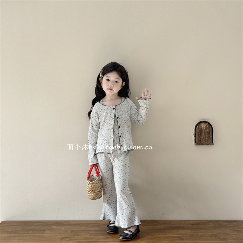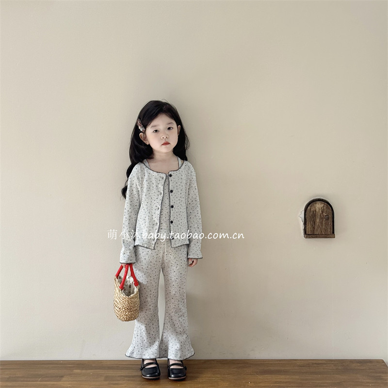 儿童洋气休闲套装2026新款韩版女童春款开衫碎花上衣喇叭裤三件套