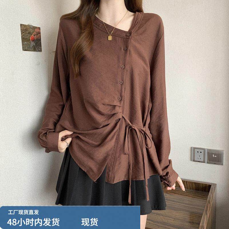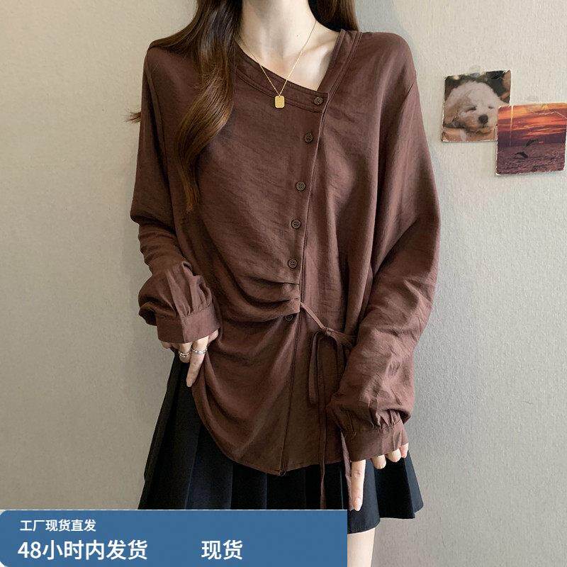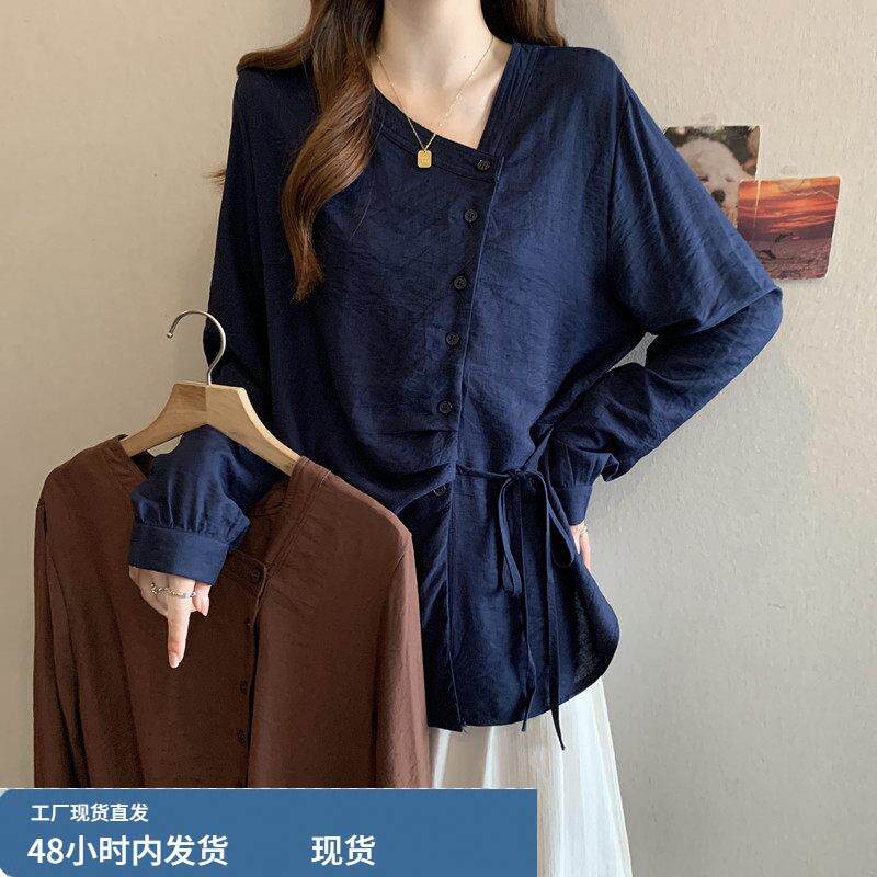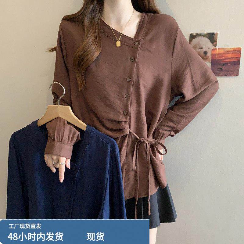斜V领长袖打底衬衫女款2026春季大码胖mm显瘦设计感系带收腰上衣