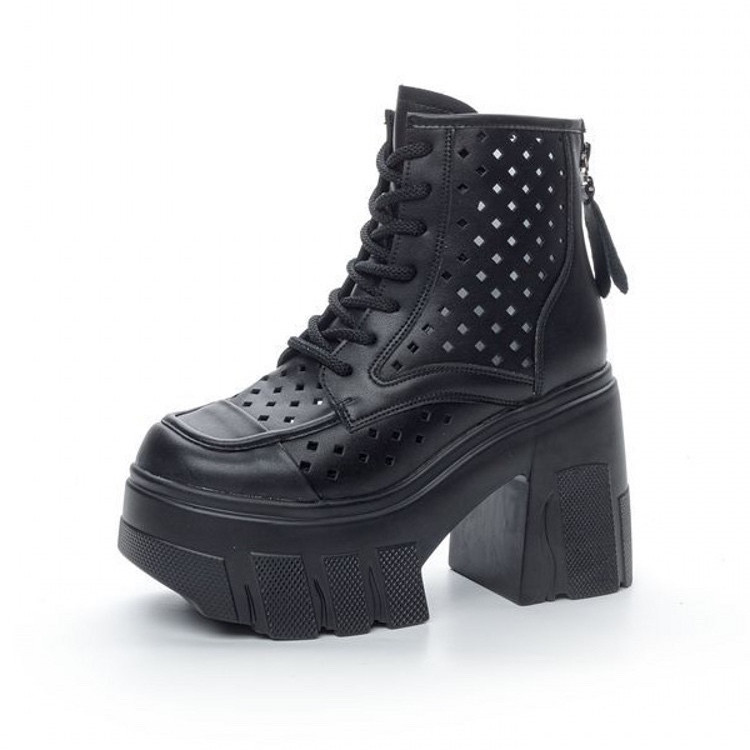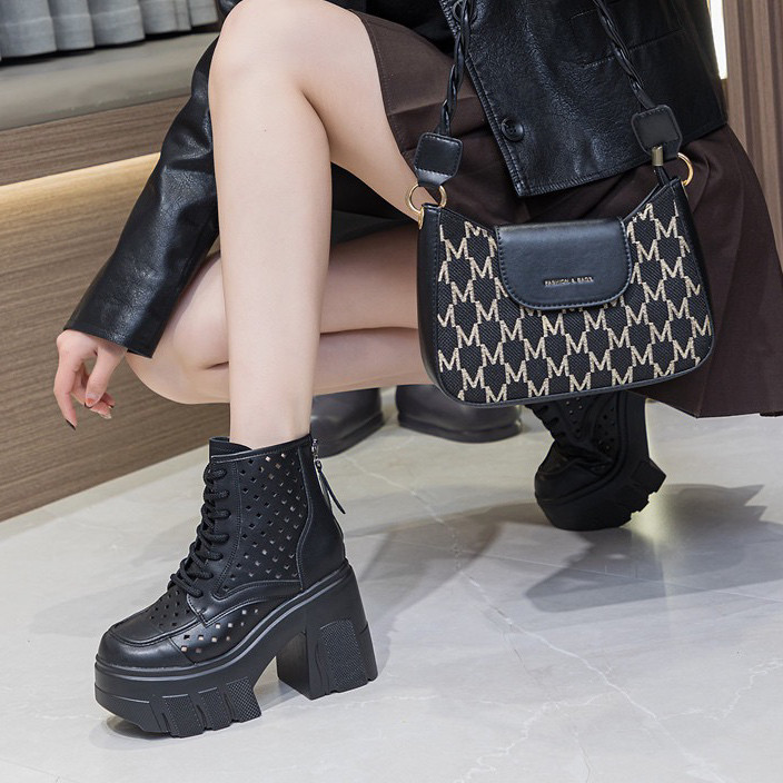 真皮镂空马丁靴女款小个子增高11cm夏季薄款短靴夏款粗跟高跟凉靴