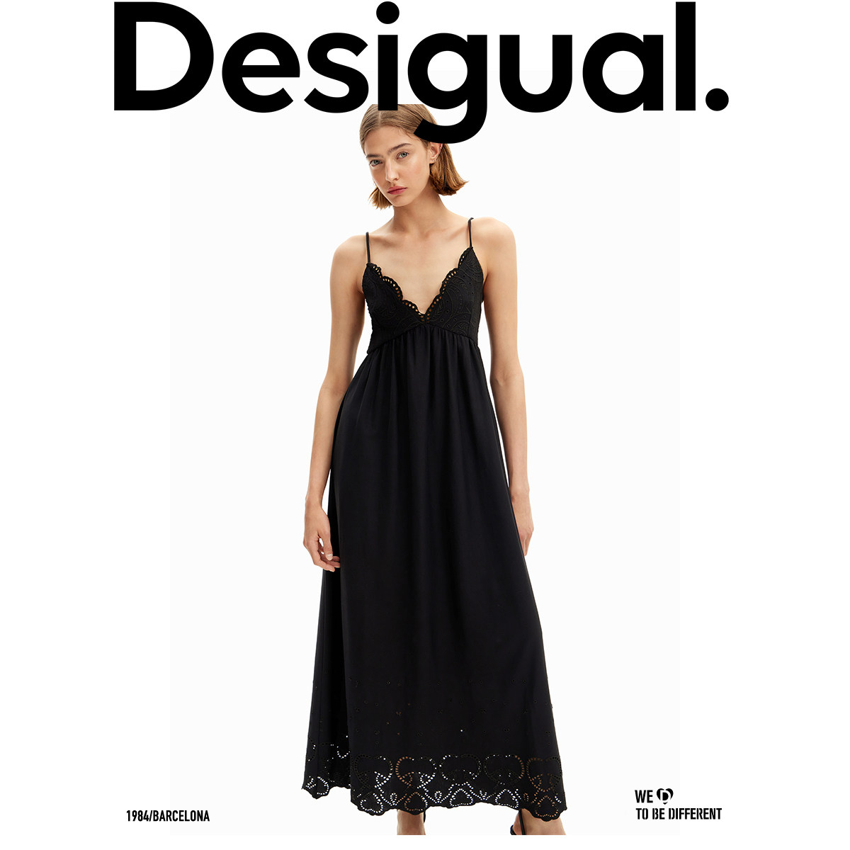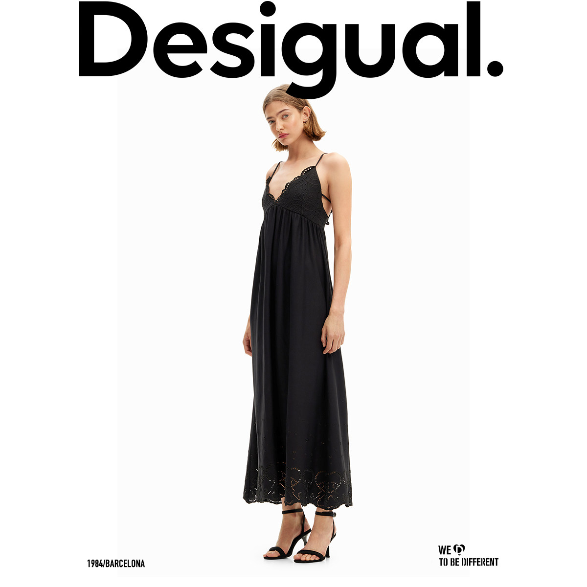 Desigual蕾丝黑色收腰显瘦长款女式吊带连衣裙无袖V领露背