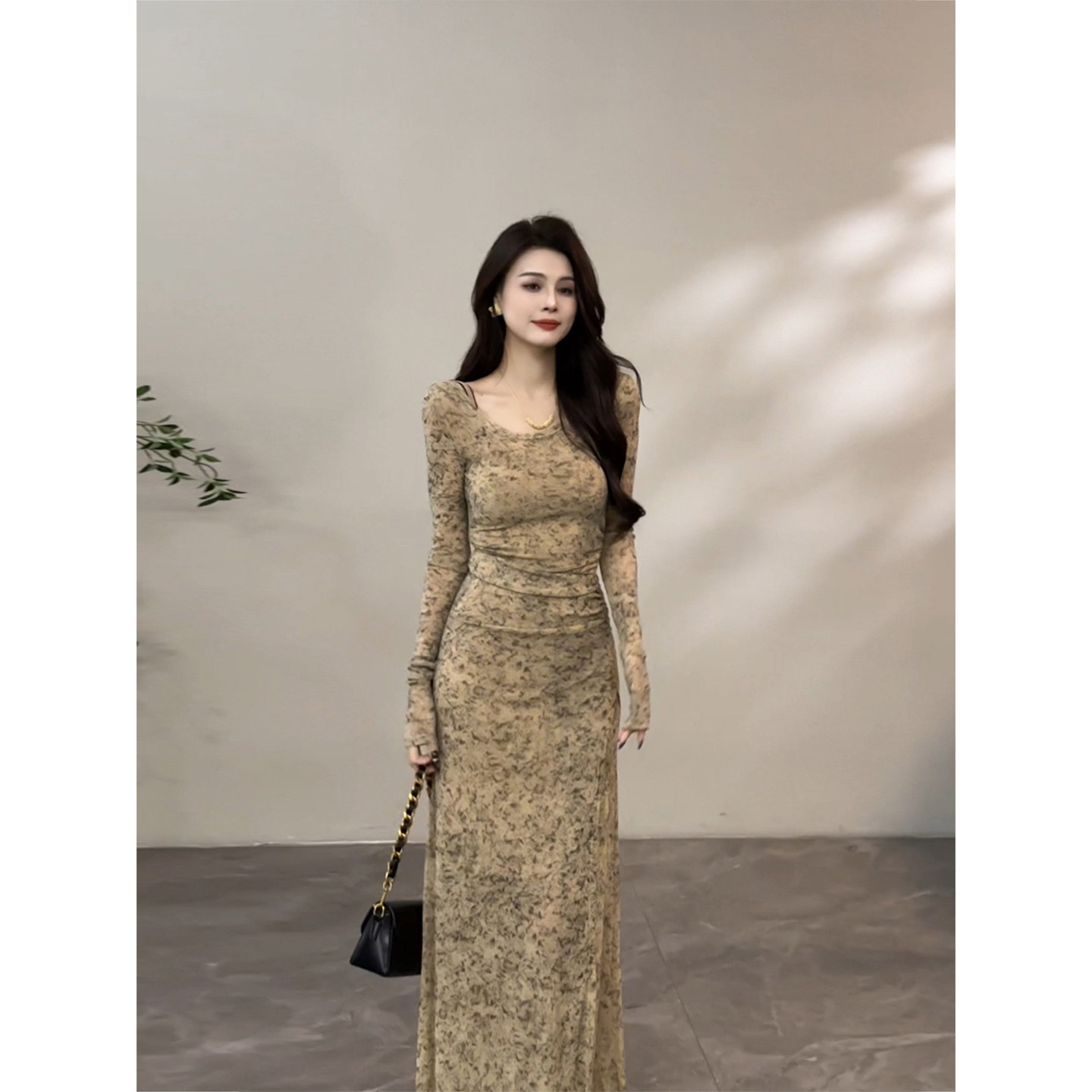 大婷婷 早秋新款长袖扎染连衣裙极简风裙子修身复古长裙DT1572