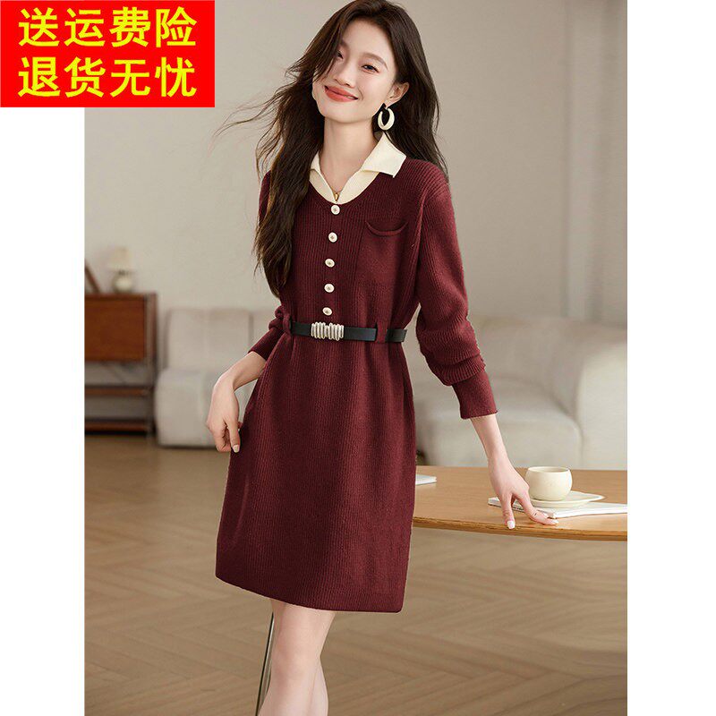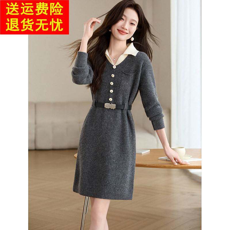 设计感假两件翻领针织连衣裙2026新款女秋冬小个子显瘦打底毛衣裙