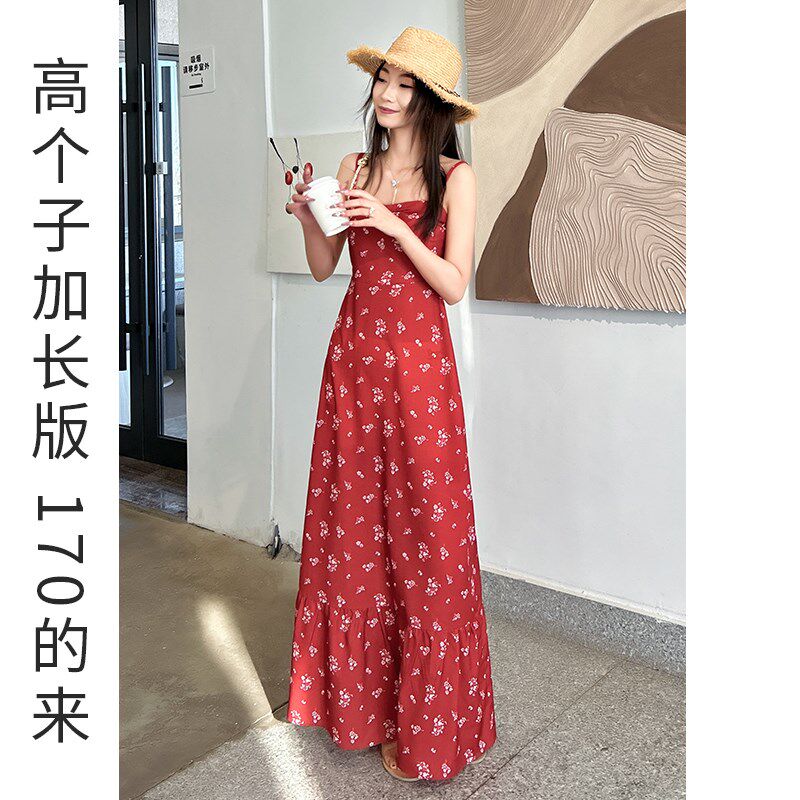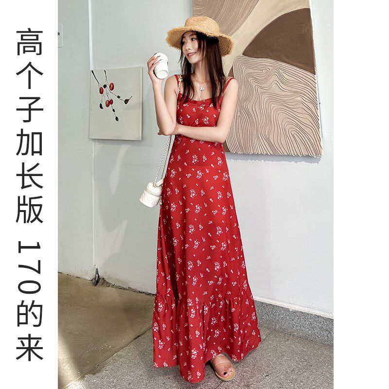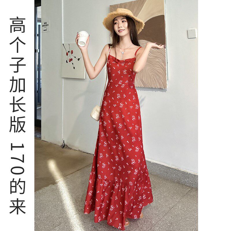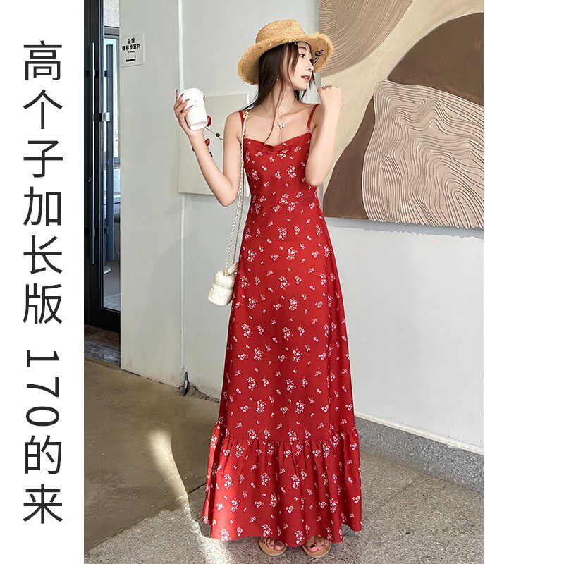 红色吊带裙高级感高个子加长版170超长款到脚踝碎花连衣裙轻奢夏
