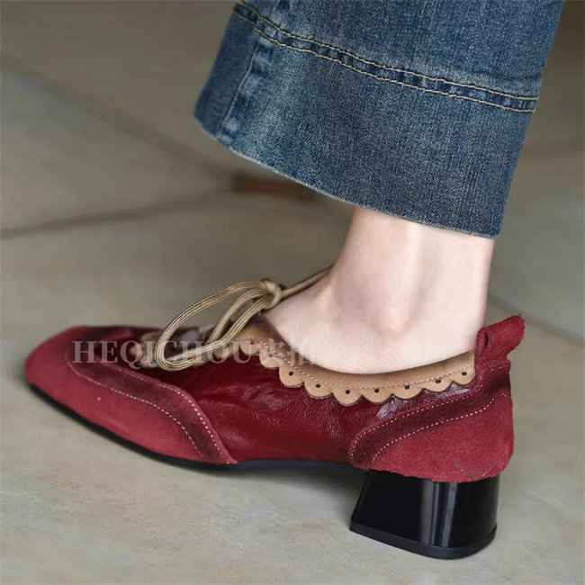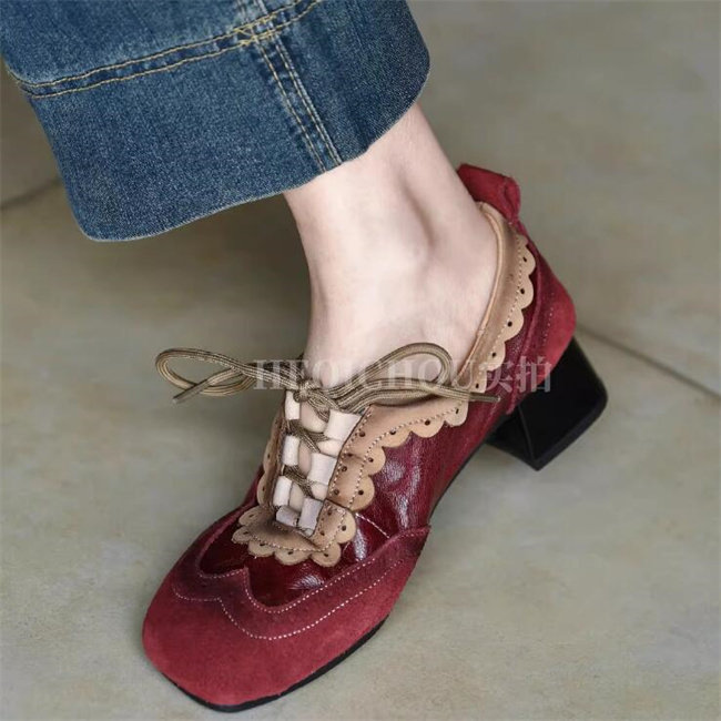 2026春季新款隐形内增高5厘米 真皮粗跟拼色系带皮鞋时尚单鞋B837