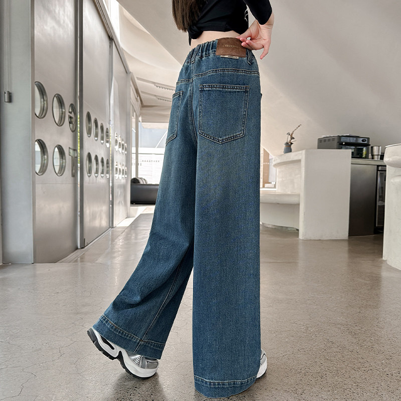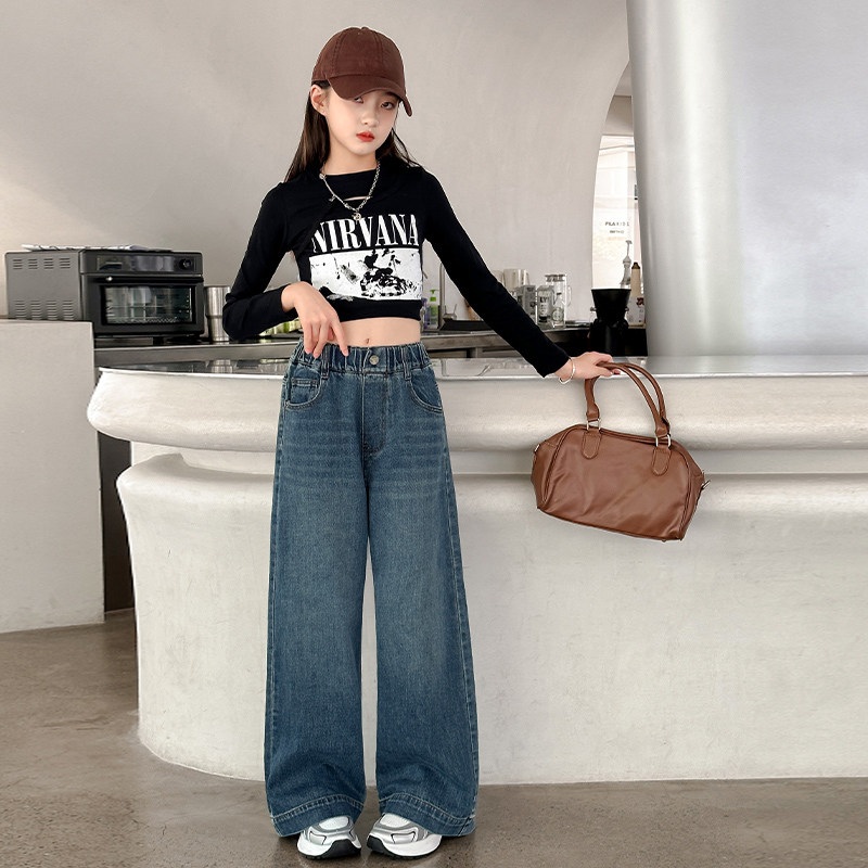 女童春装牛仔裤2026新款初中生字母贴标阔腿裤中大童女孩春季裤子