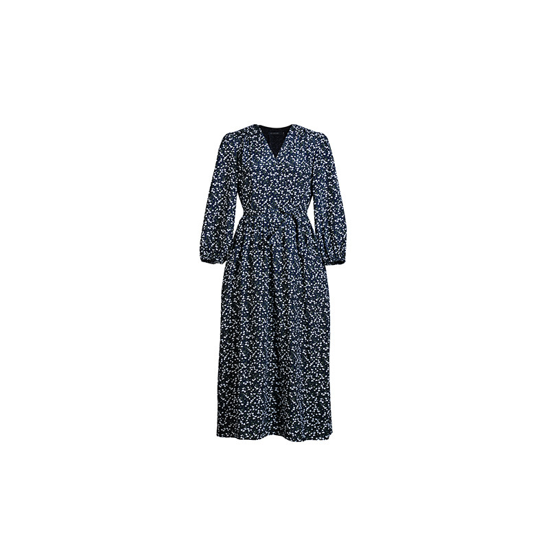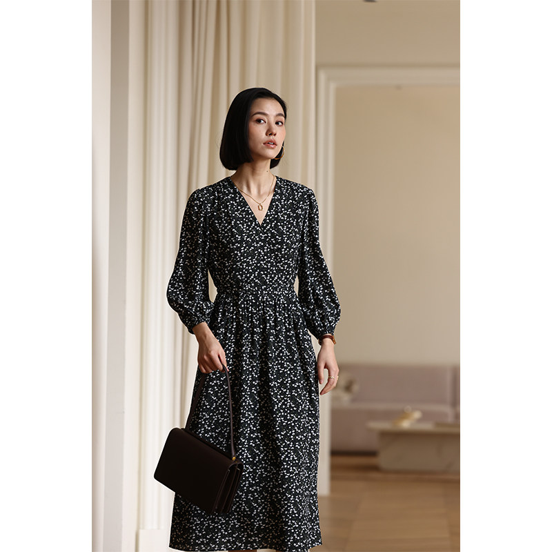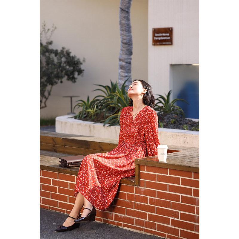 HeyDress法式碎花连衣裙女春秋复古V领显瘦温柔红色长袖茶歇裙子