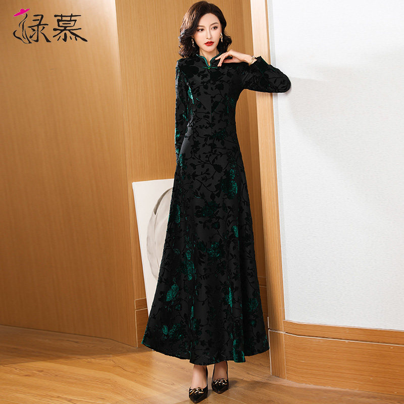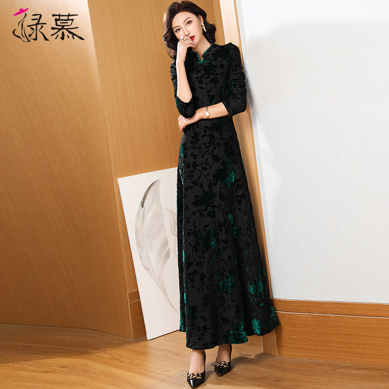 2026春春秋新款绿色提花连衣裙长袖修身显瘦高档气质超长大摆裙