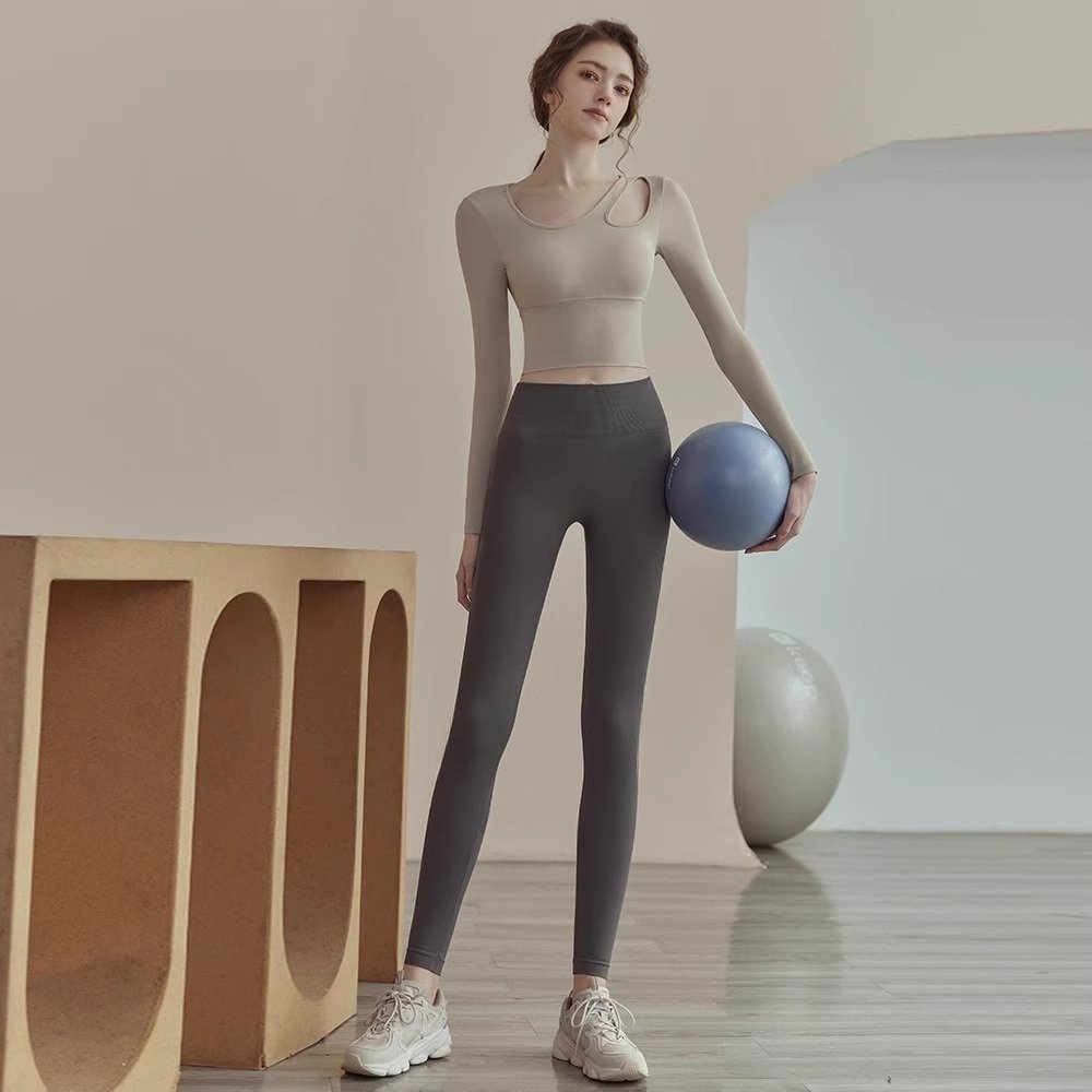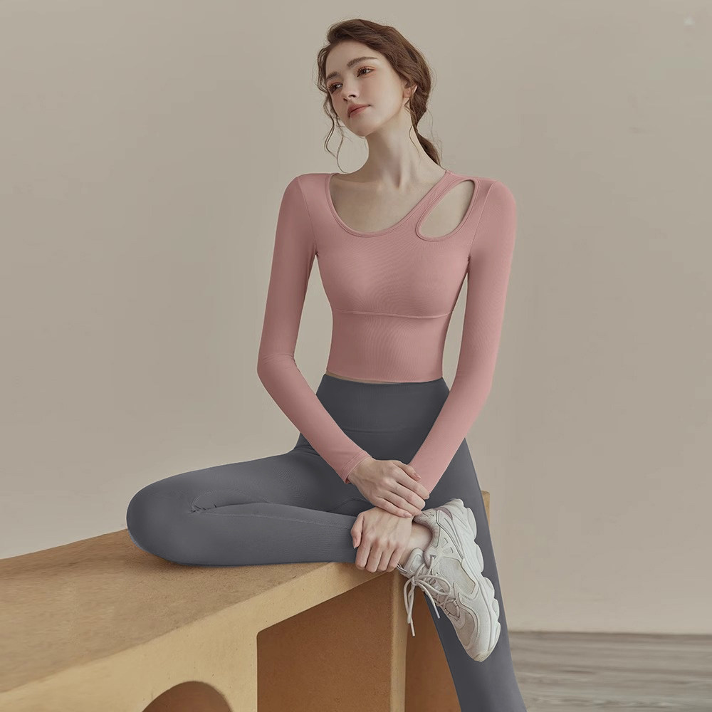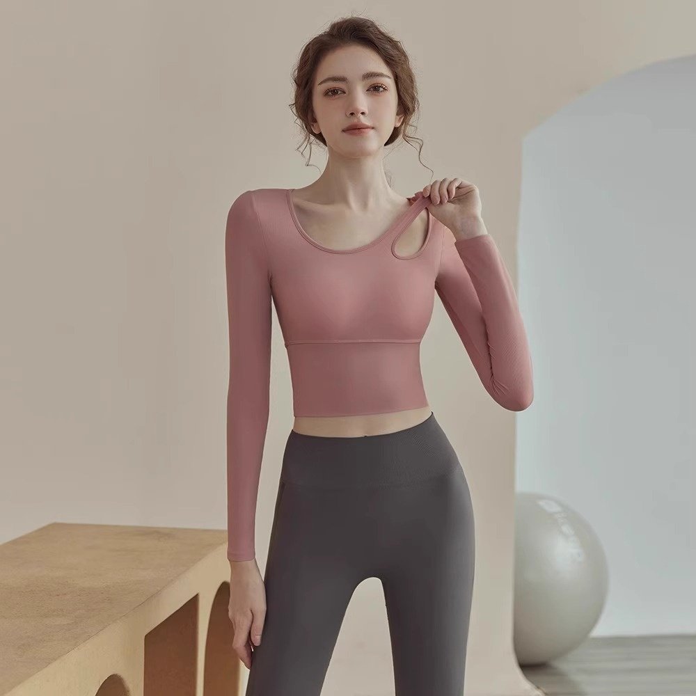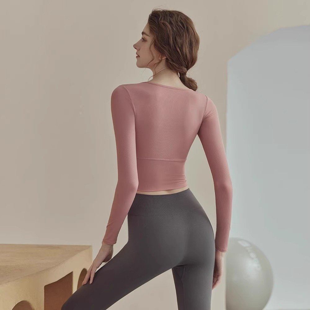 春季瑜伽服套装女士带胸垫长袖运动上衣跑步训练速干衣专业健身服