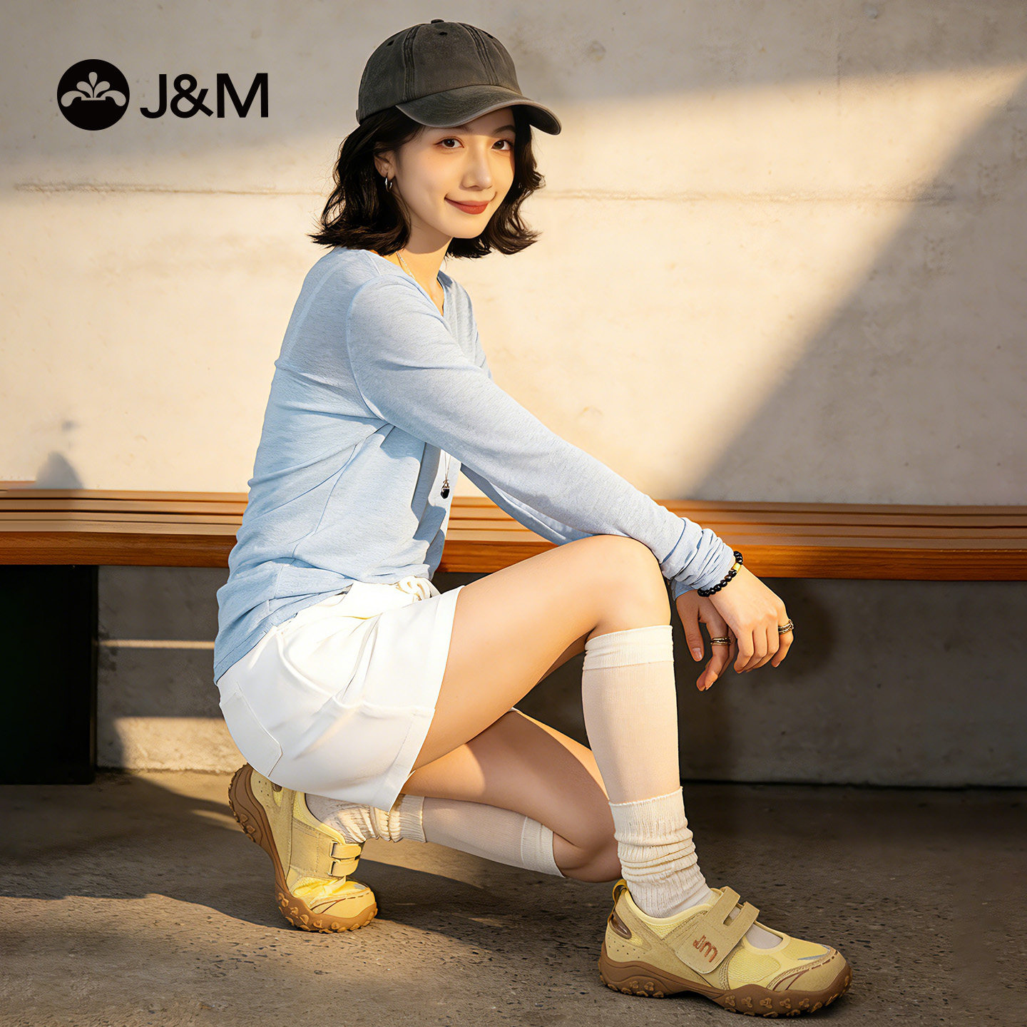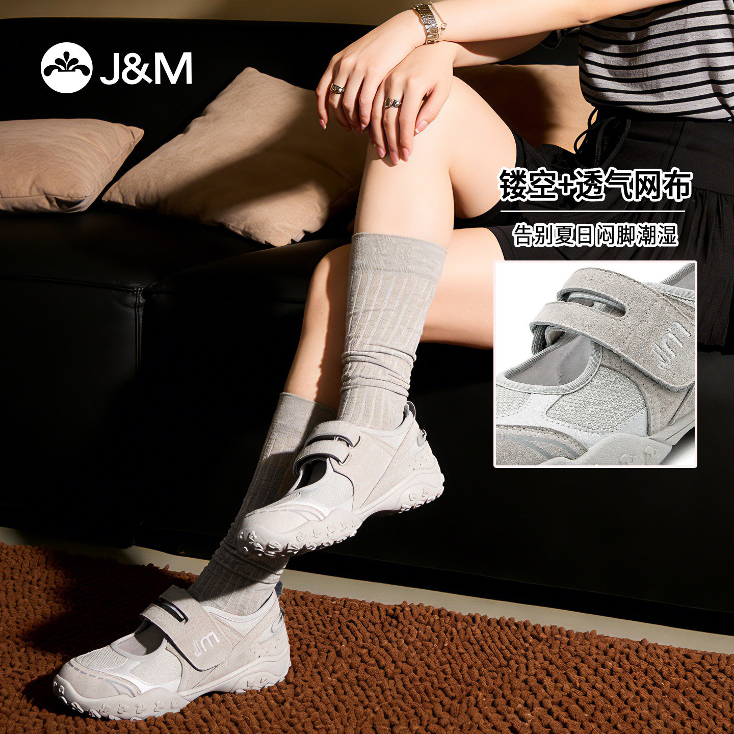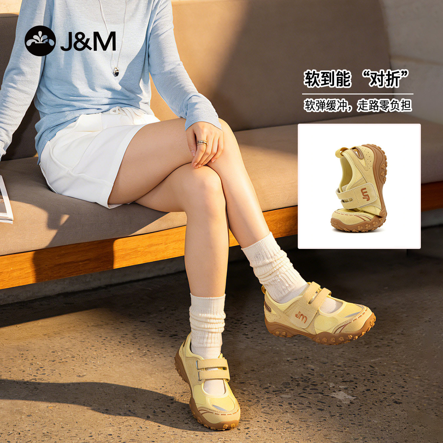 鞋子软底防滑女士运动鞋玛丽珍女鞋2026新款夏季黄色魔术贴镂空鞋