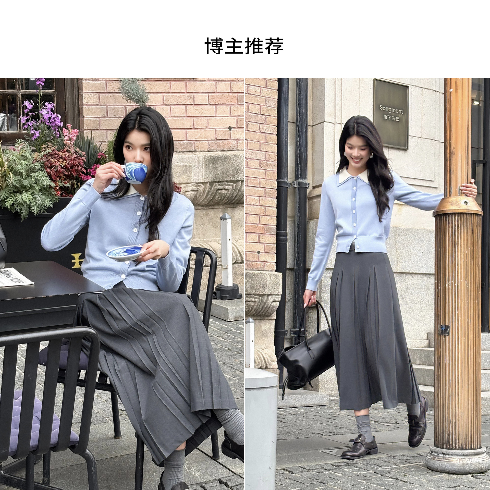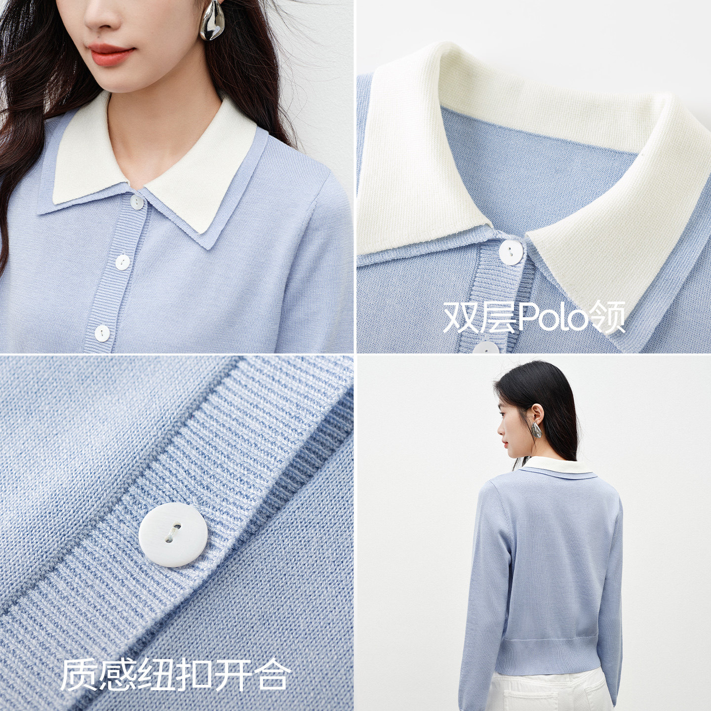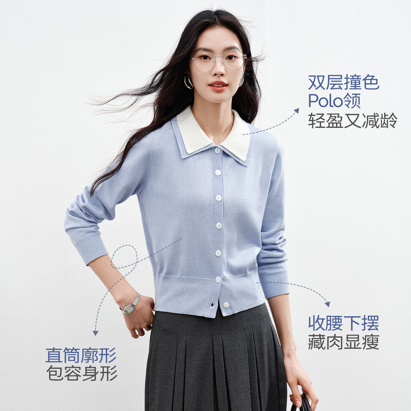 衣香丽影蓝色翻领新款上衣撞色丝光羊毛轻薄针织开衫春装女款2026
