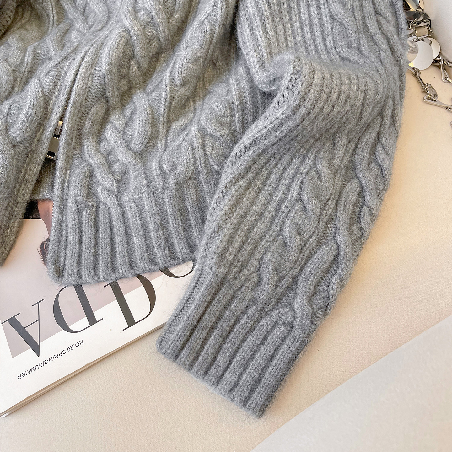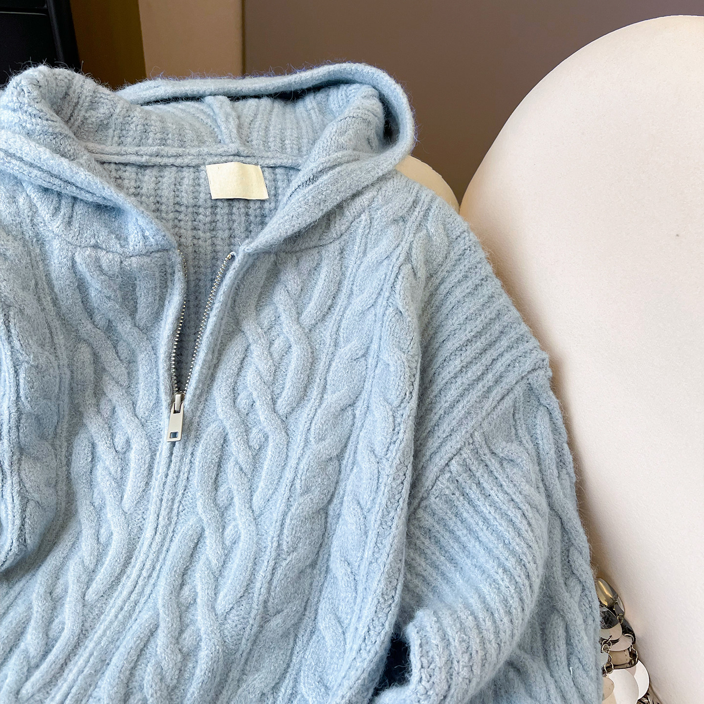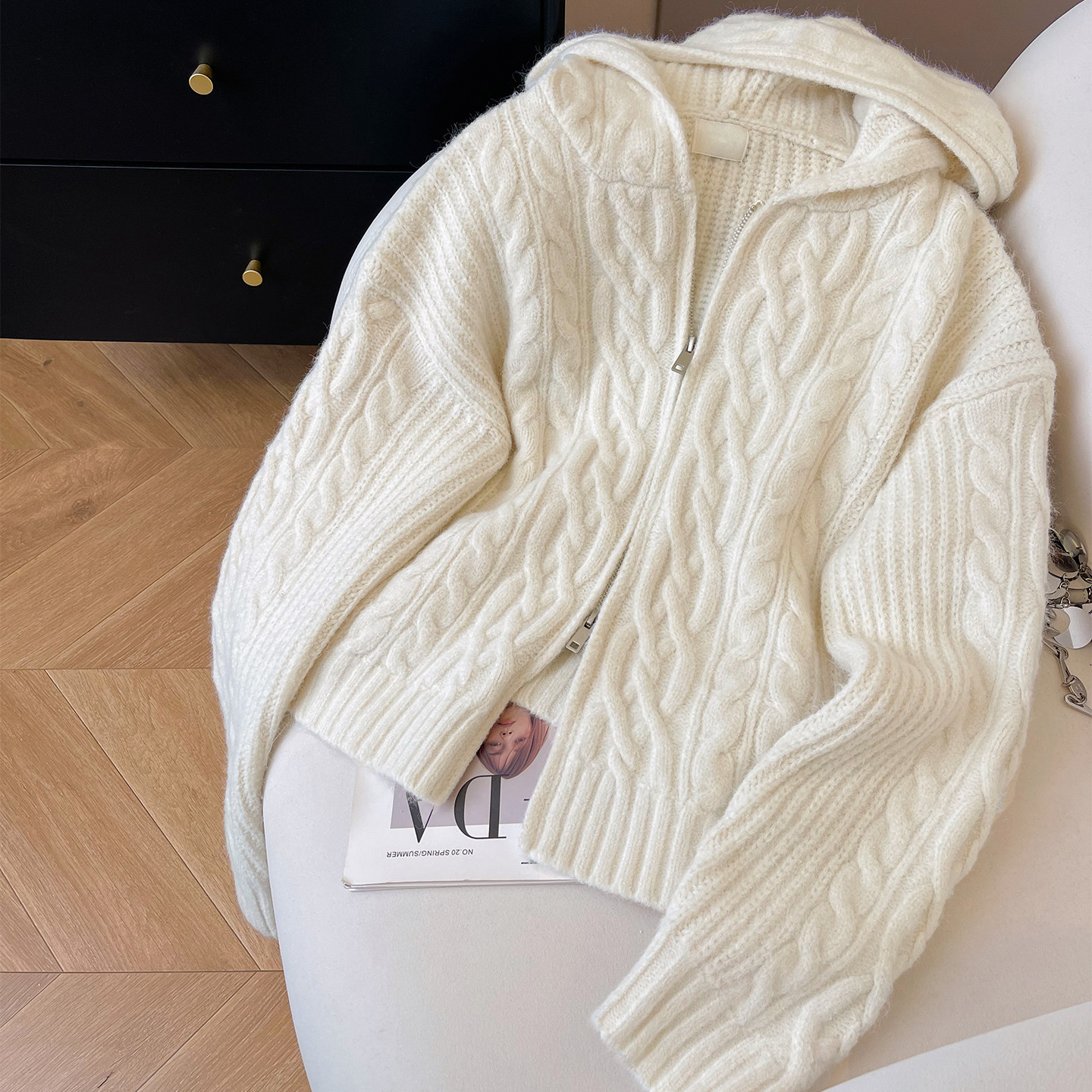 小C家 麻花连帽毛衣开衫外套女2025新款秋冬加厚宽松慵懒风针织衫
