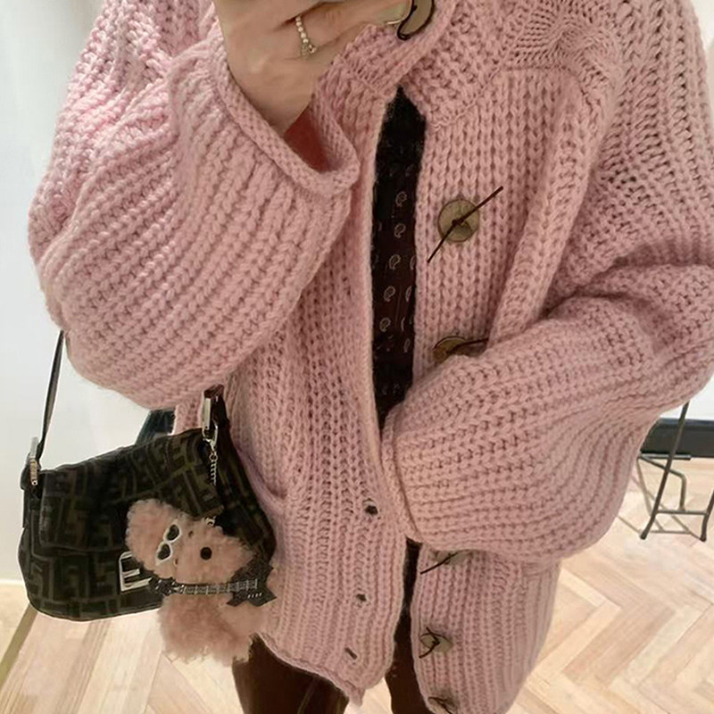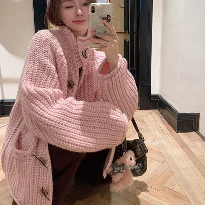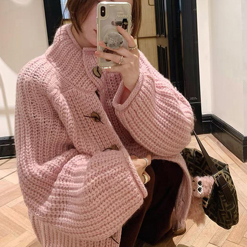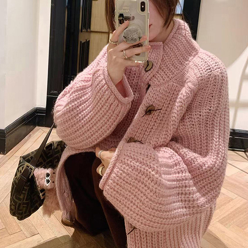 韩系粉色粗针高领加厚毛衣外套女秋冬氛围感慵懒宽松针织开衫上衣