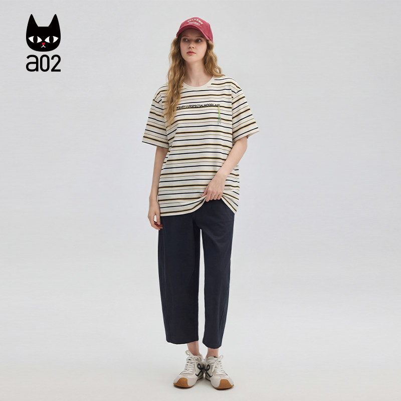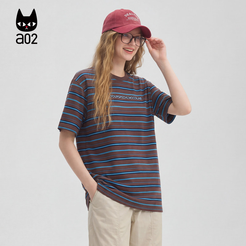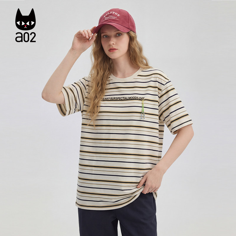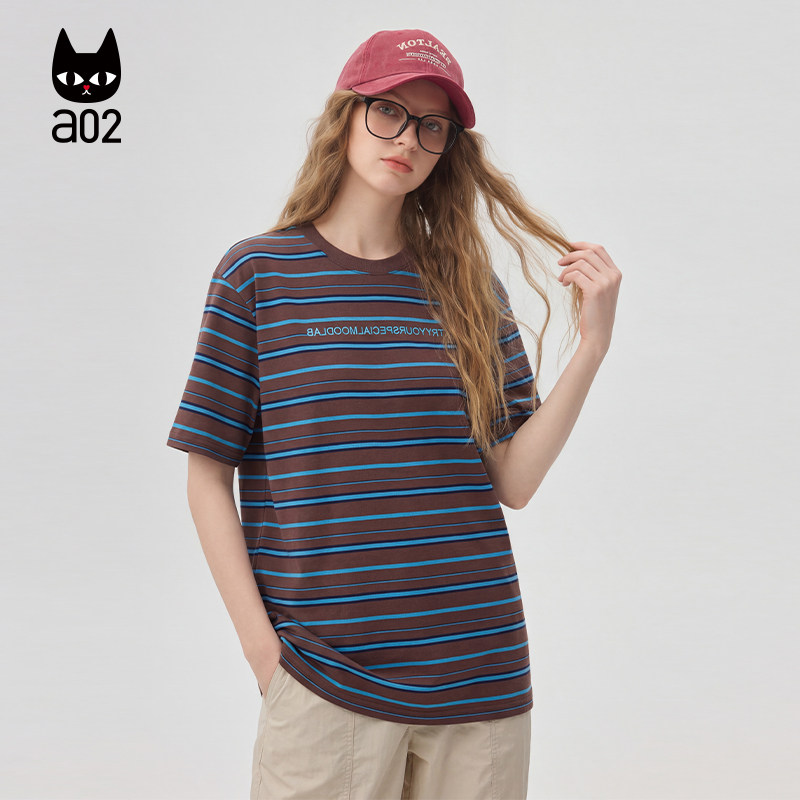 a02宽松绣花条纹短袖T恤女款2026新款夏季半袖上衣薄款透气设计感