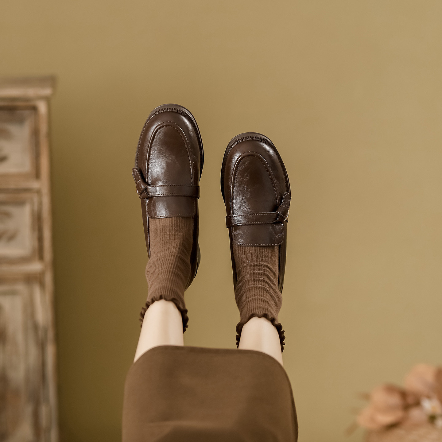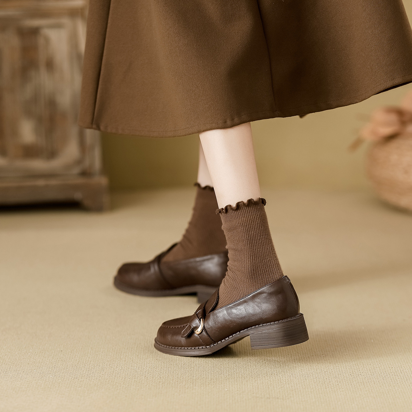 真皮棕色乐福鞋女2026新款春季软底粗跟单鞋英伦风复古百搭小皮鞋