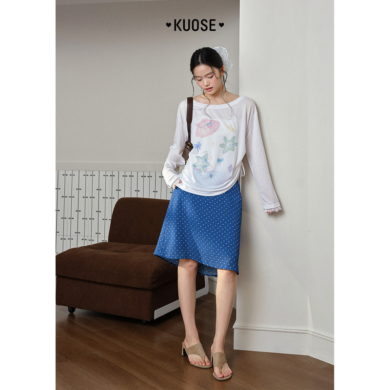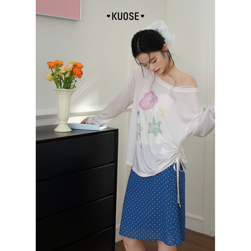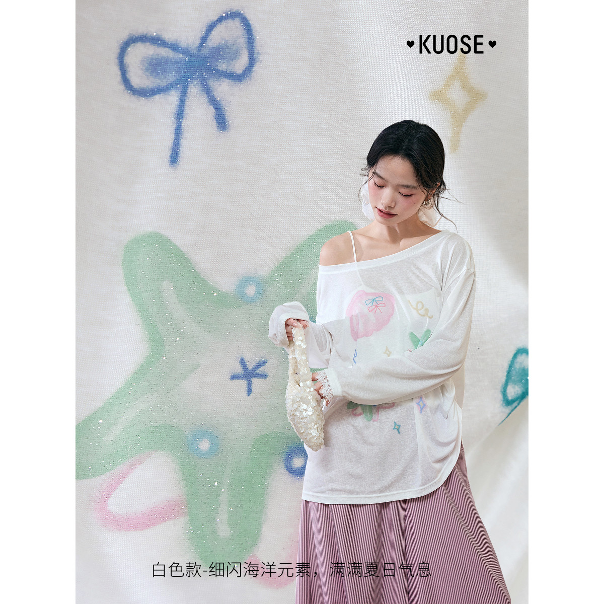 阔色白色印花长袖t恤罩衫2026春夏季新款小女生露肩薄款天丝上衣