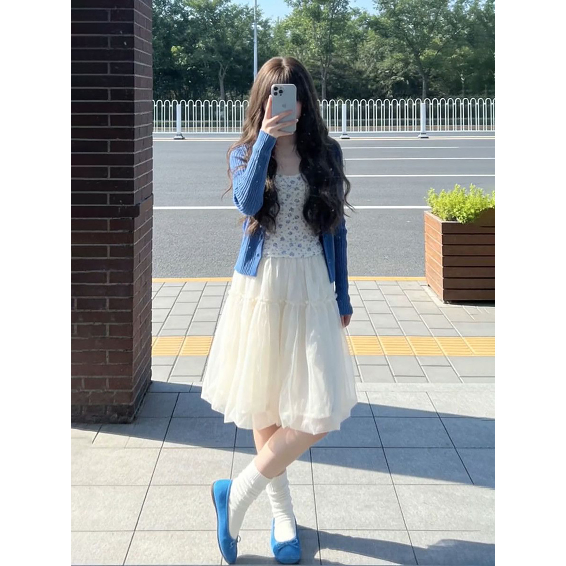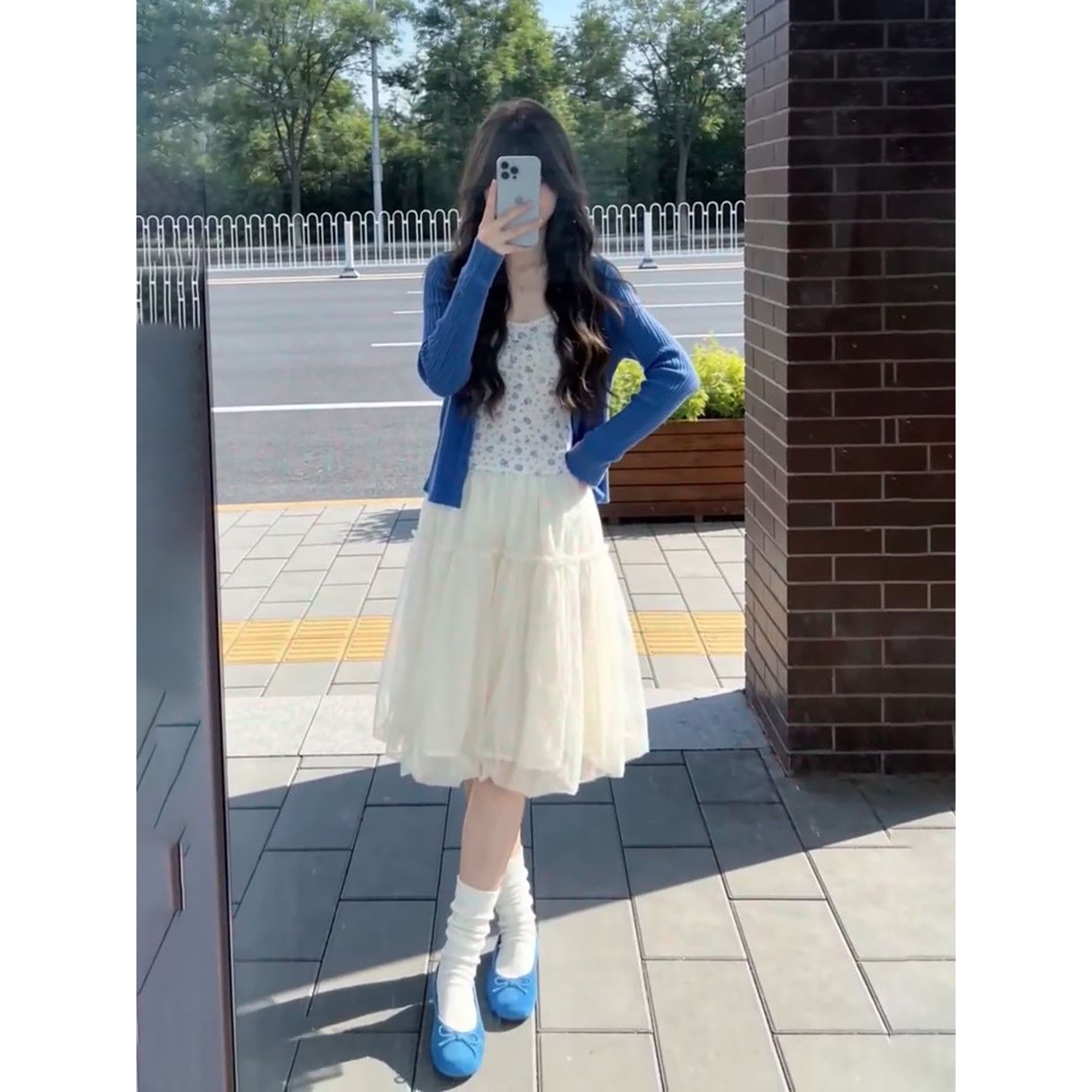 2026新款温柔甜美风蓝色针织开衫+碎花吊带+蕾丝花苞短裙三件套装