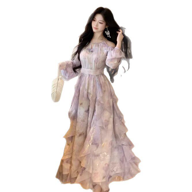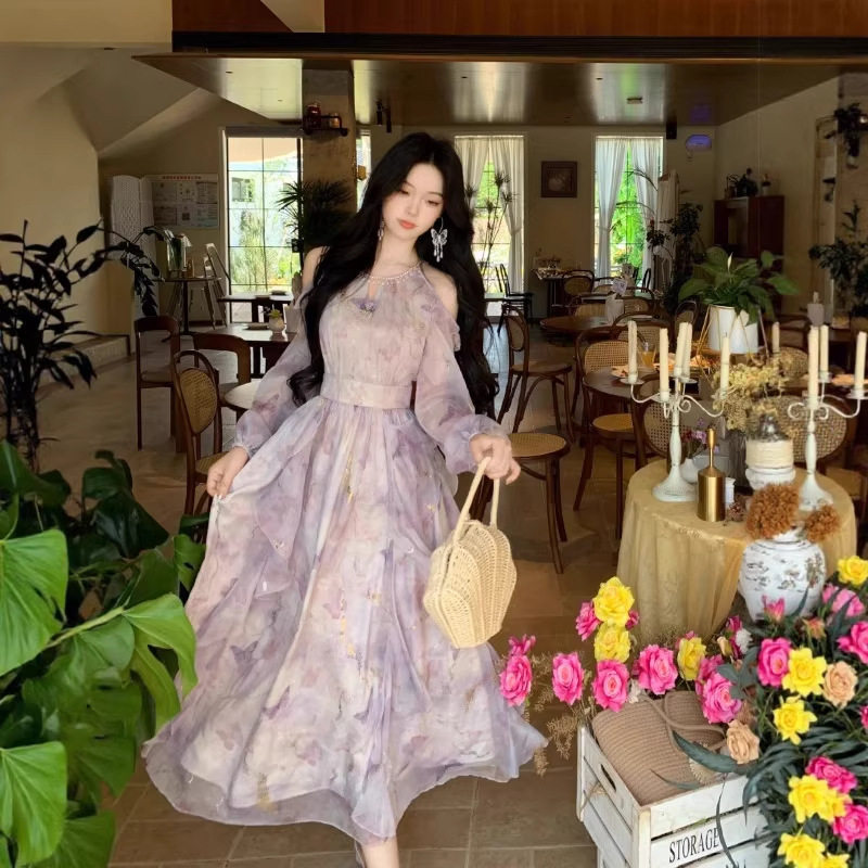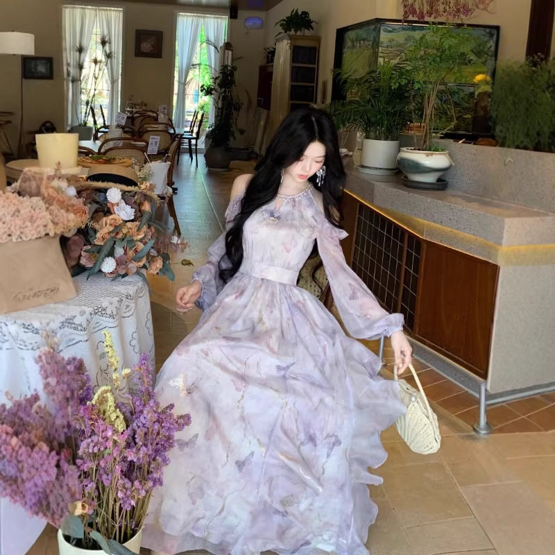 法式气质露肩蝴蝶印花长袖连衣裙女春夏高级感不规则荷叶边长裙子