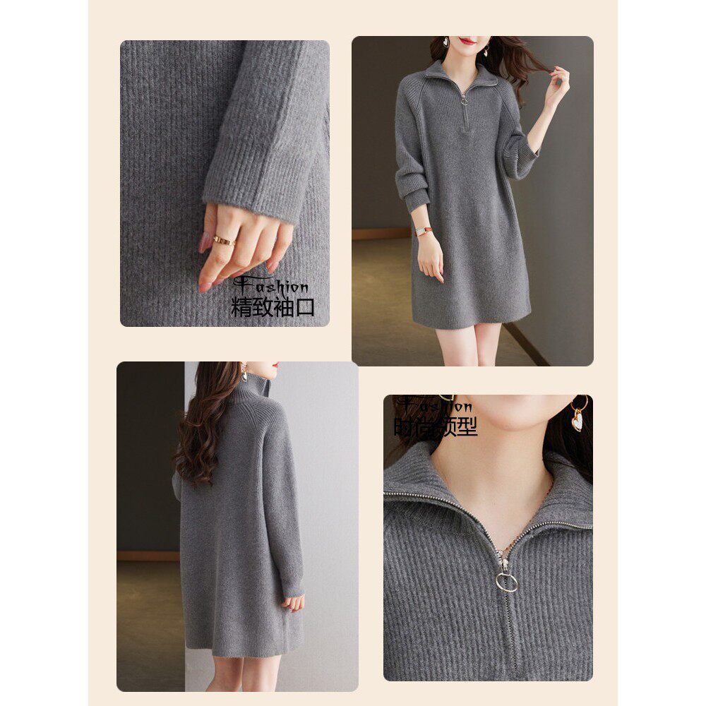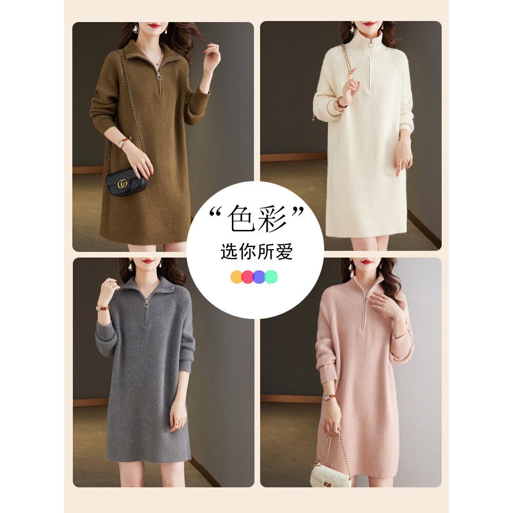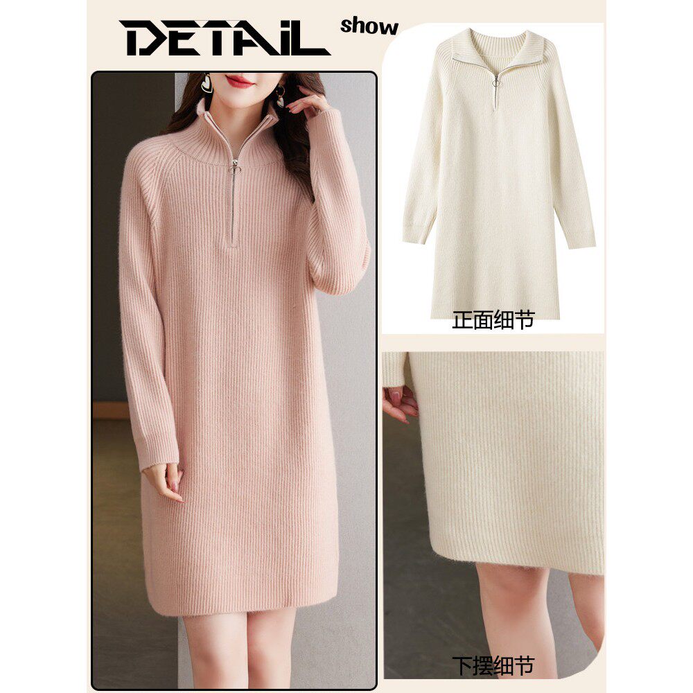时尚粉色高领毛衣女宽松外穿中长款秋冬立领打底衫拉链针织连衣裙