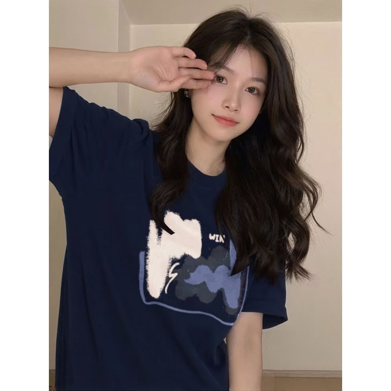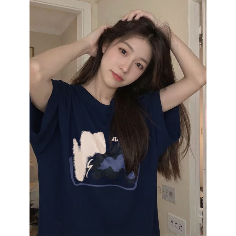 短袖t恤女款2025新款爆款夏纯棉胖mm显瘦遮肚子大码女装蓝色上衣