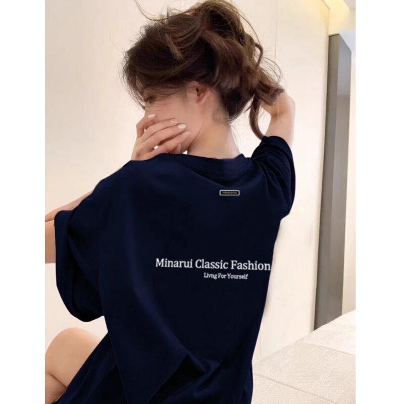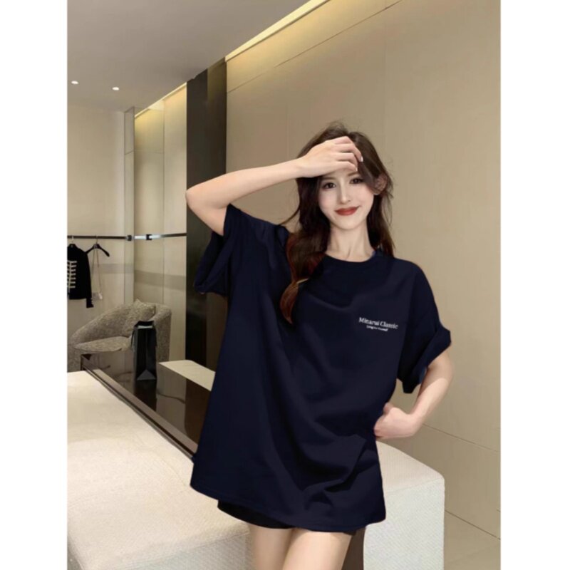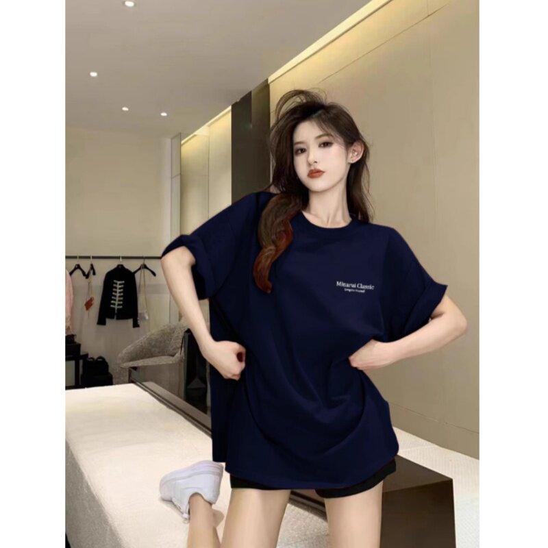 藏蓝色纯棉短袖t恤女夏季2026新款宽松美式复古重磅情侣半袖上衣