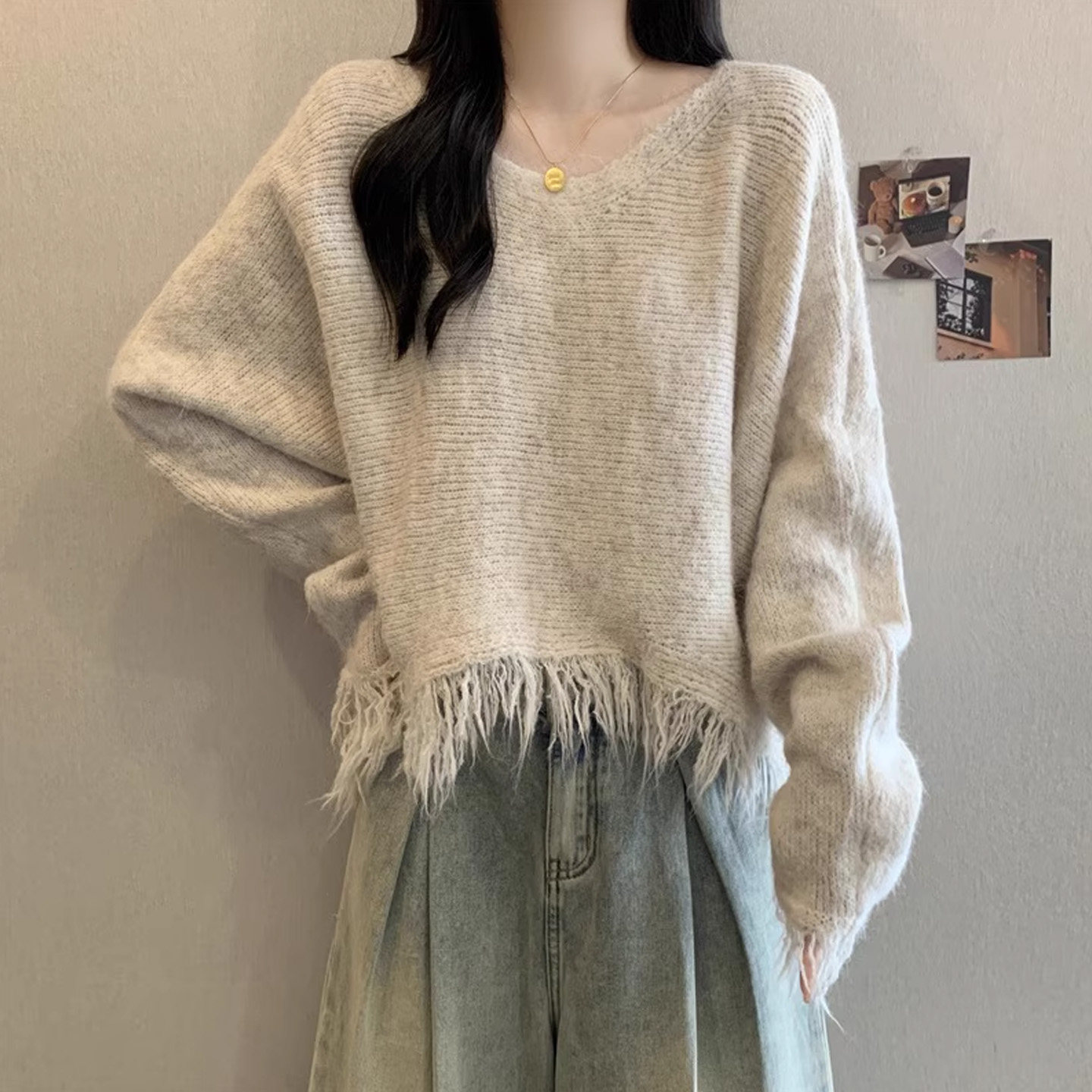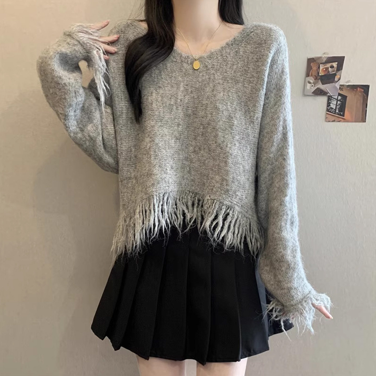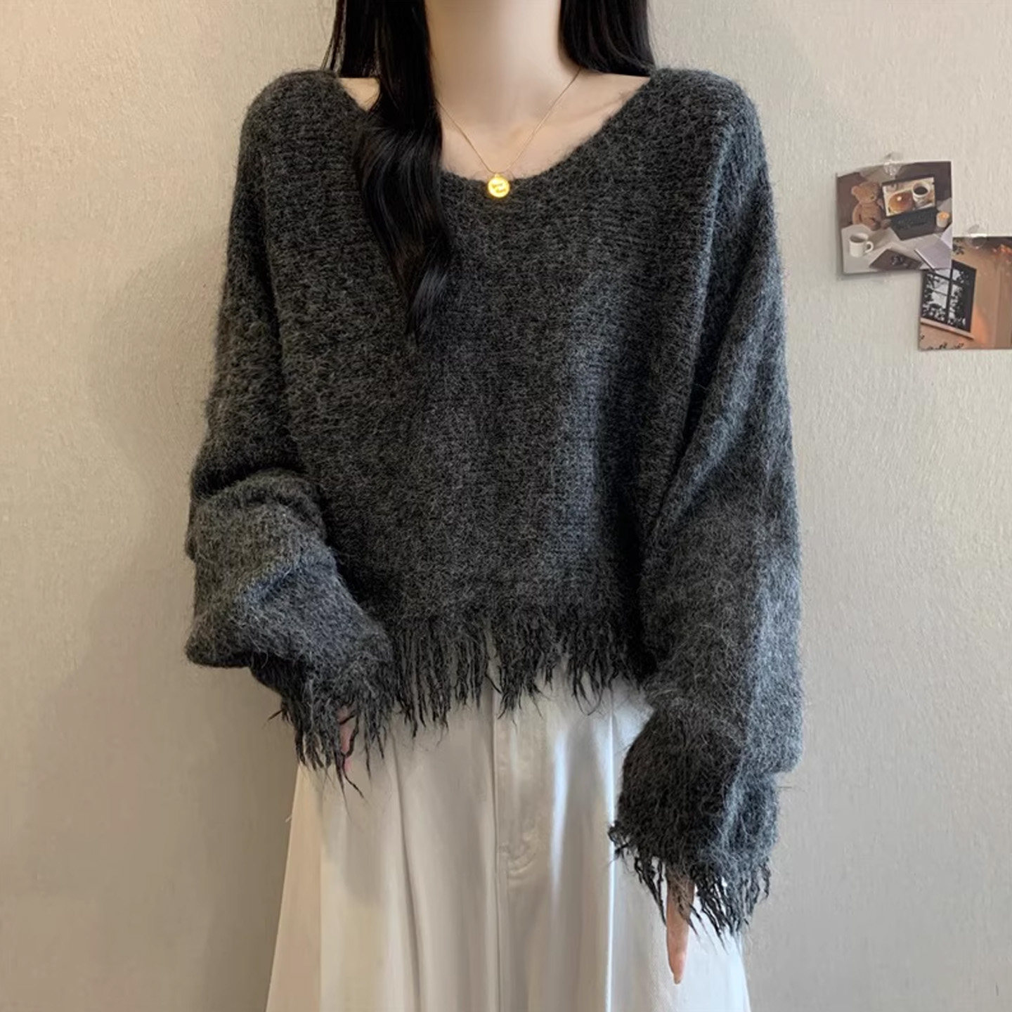 灰色流苏毛衣女款2026秋冬新款大码宽松不规则短款针织衫显瘦上衣
