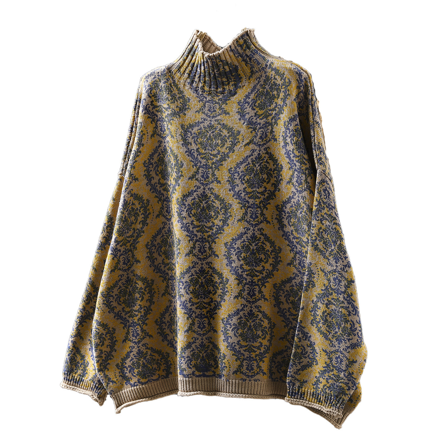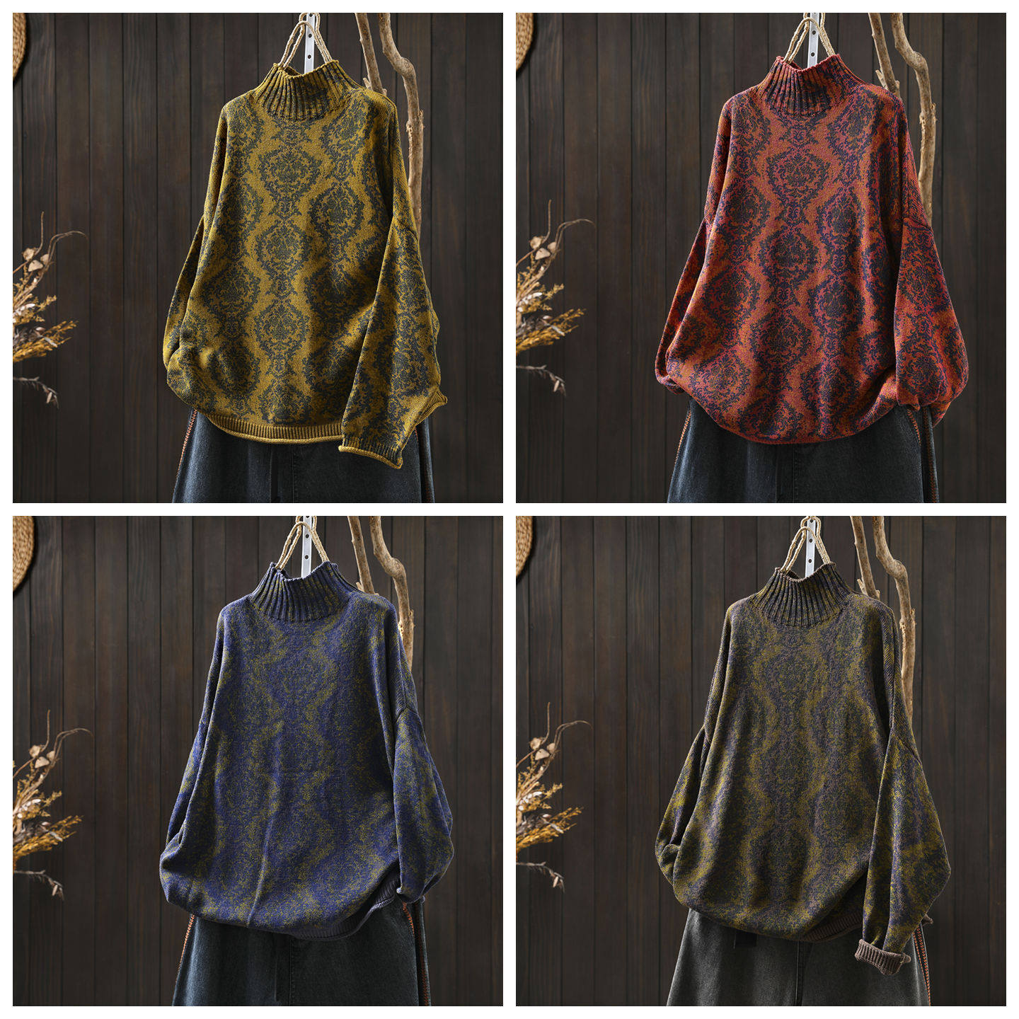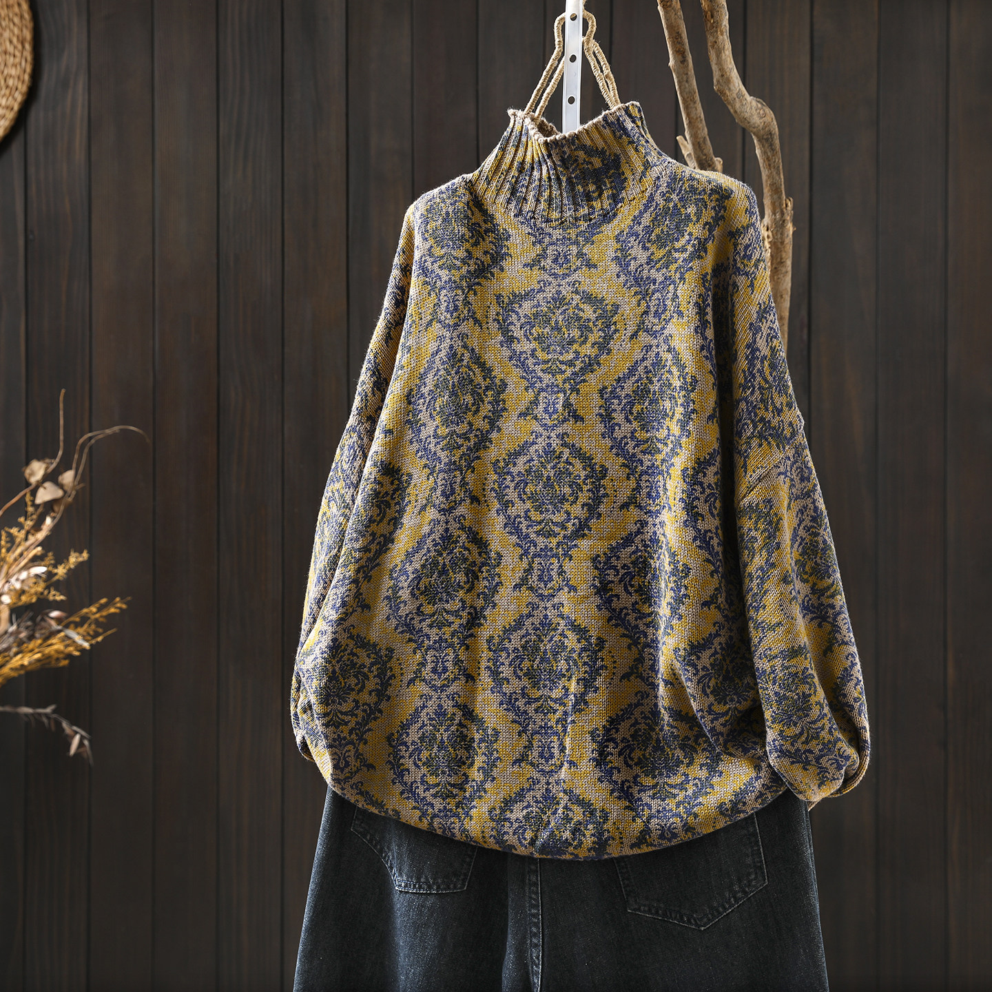 毛衣女款2026新款秋冬季半高领复古民族风印花大码宽松针织毛线衣