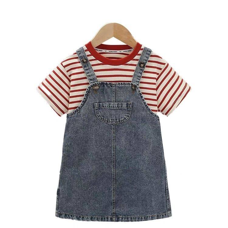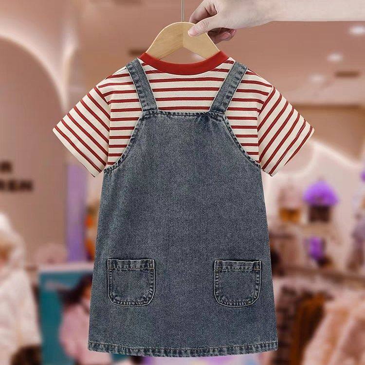 女童牛仔背带裙韩版百搭短袖条纹t恤夏季连衣裙子女宝宝儿童套装