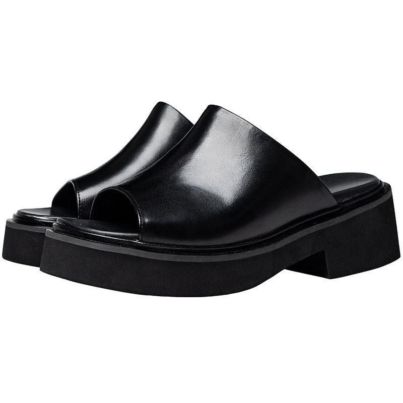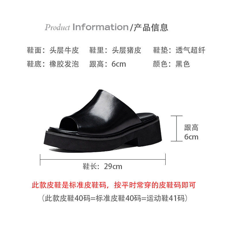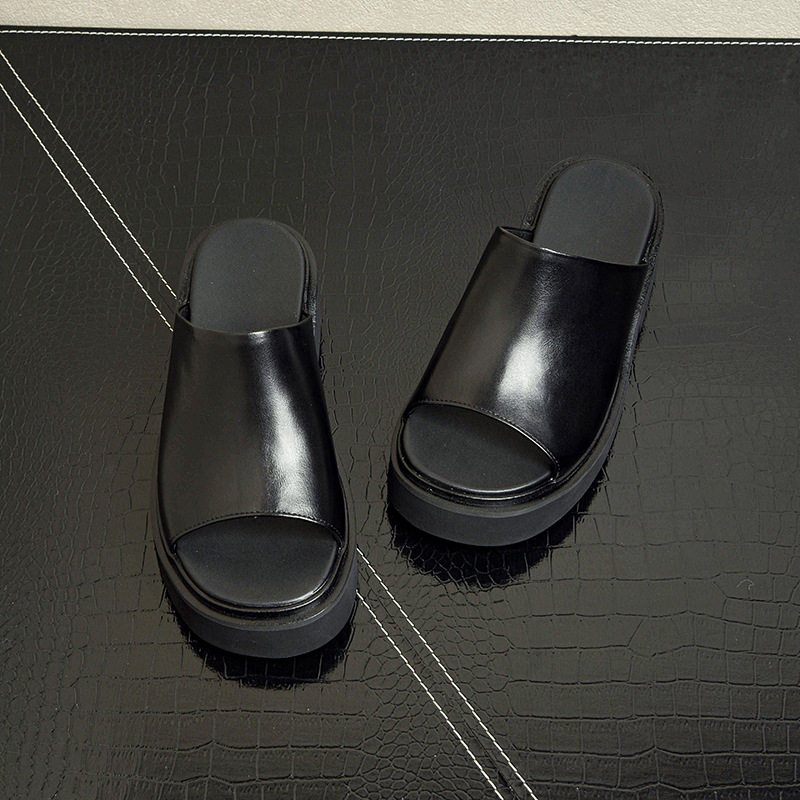 高档头层牛皮松糕底厚底发型师拖鞋男增高跟6厘米鱼嘴脱鞋一字拖