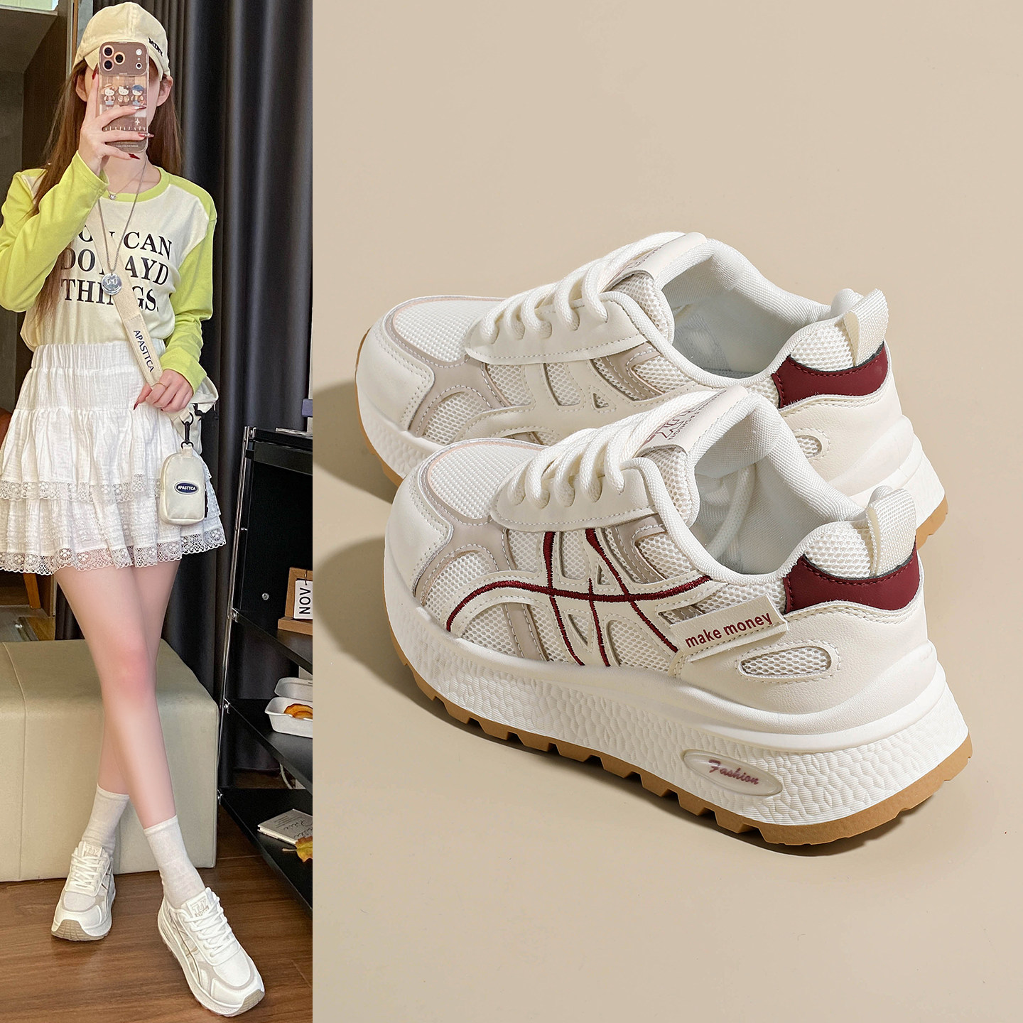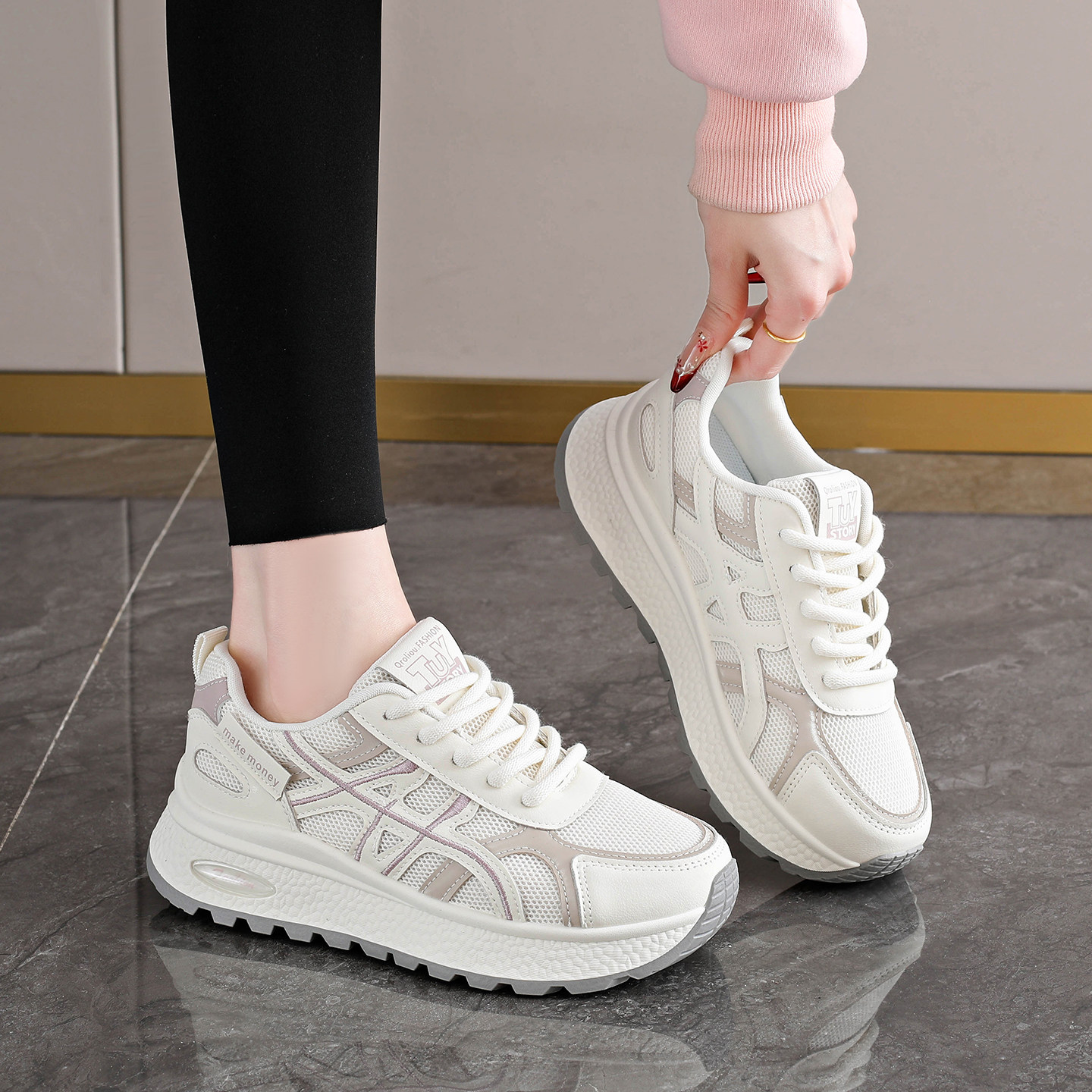 厚底阿甘老爹鞋女款2026新款春季网面透气小白鞋防滑显脚小运动鞋
