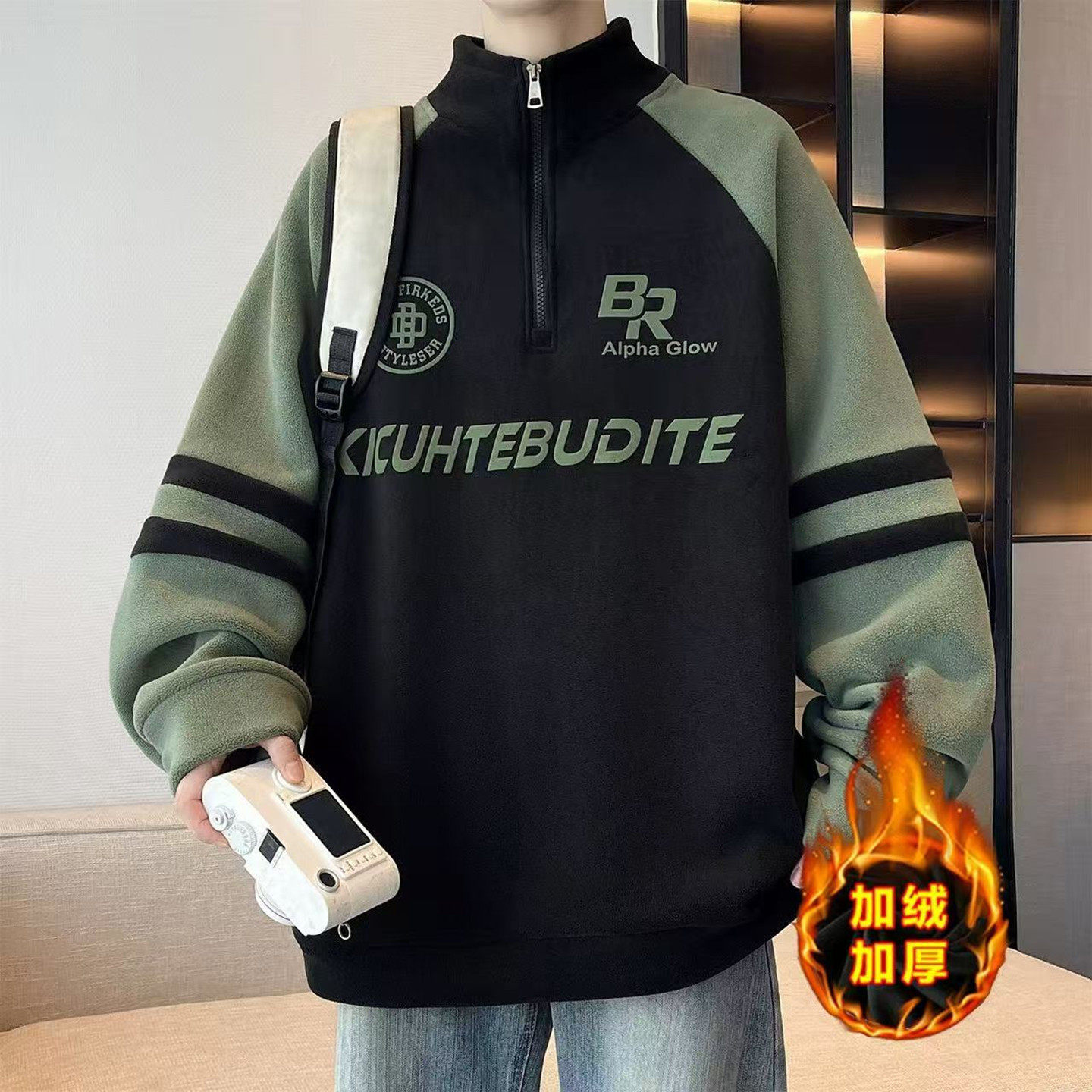 半高领拉链加绒卫衣男秋冬季加厚保暖青少年双面奥粒绒上衣打底衫