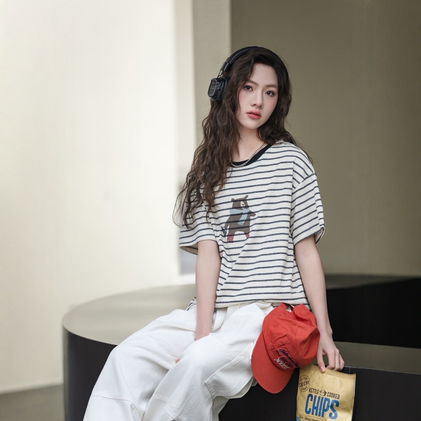 短袖圆领条纹T恤衫针织微笑天地夏季新款女孩中大童青少年女装