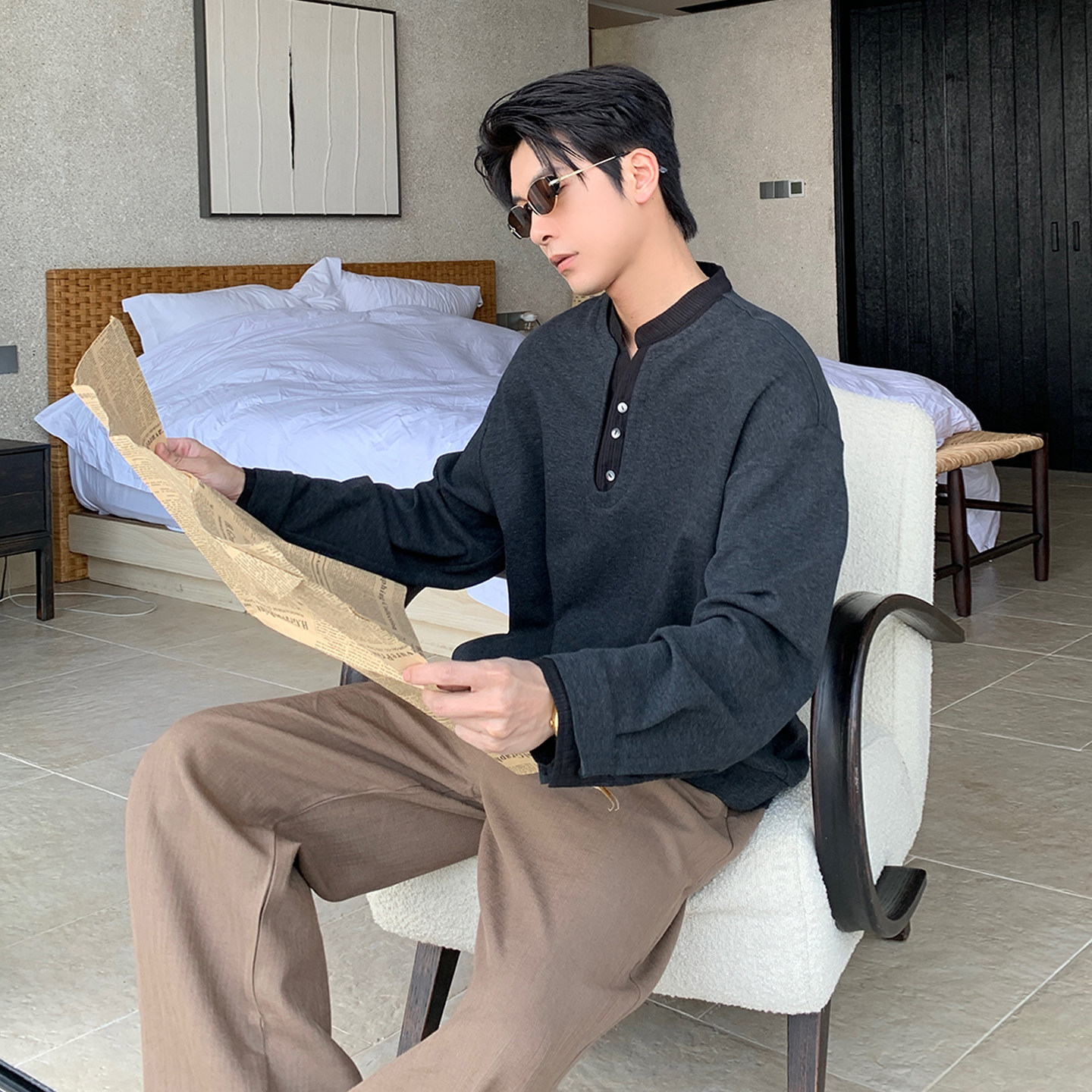 Hualun男生ootd穿搭假两件上衣男款长袖t恤男士韩版简约百搭衣服