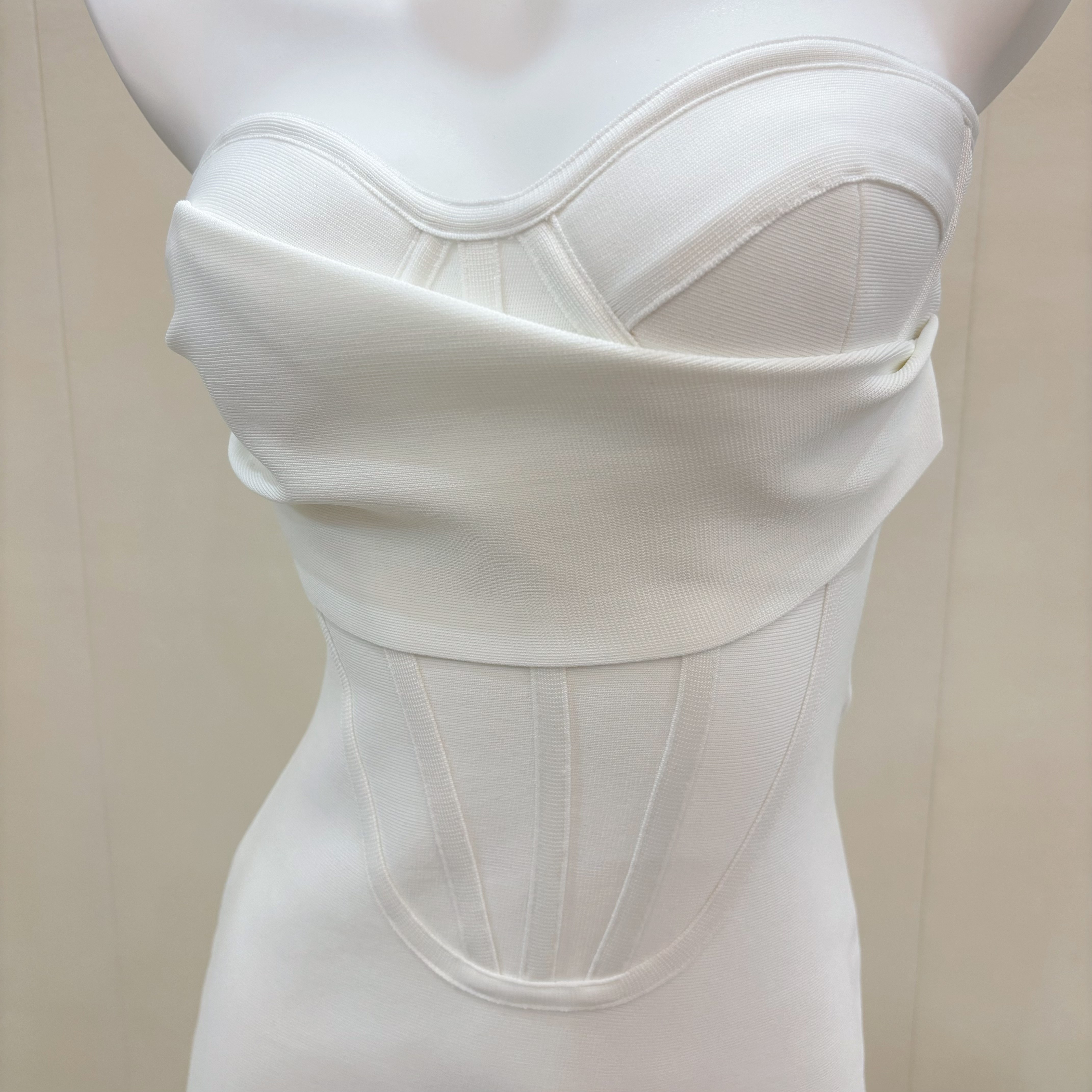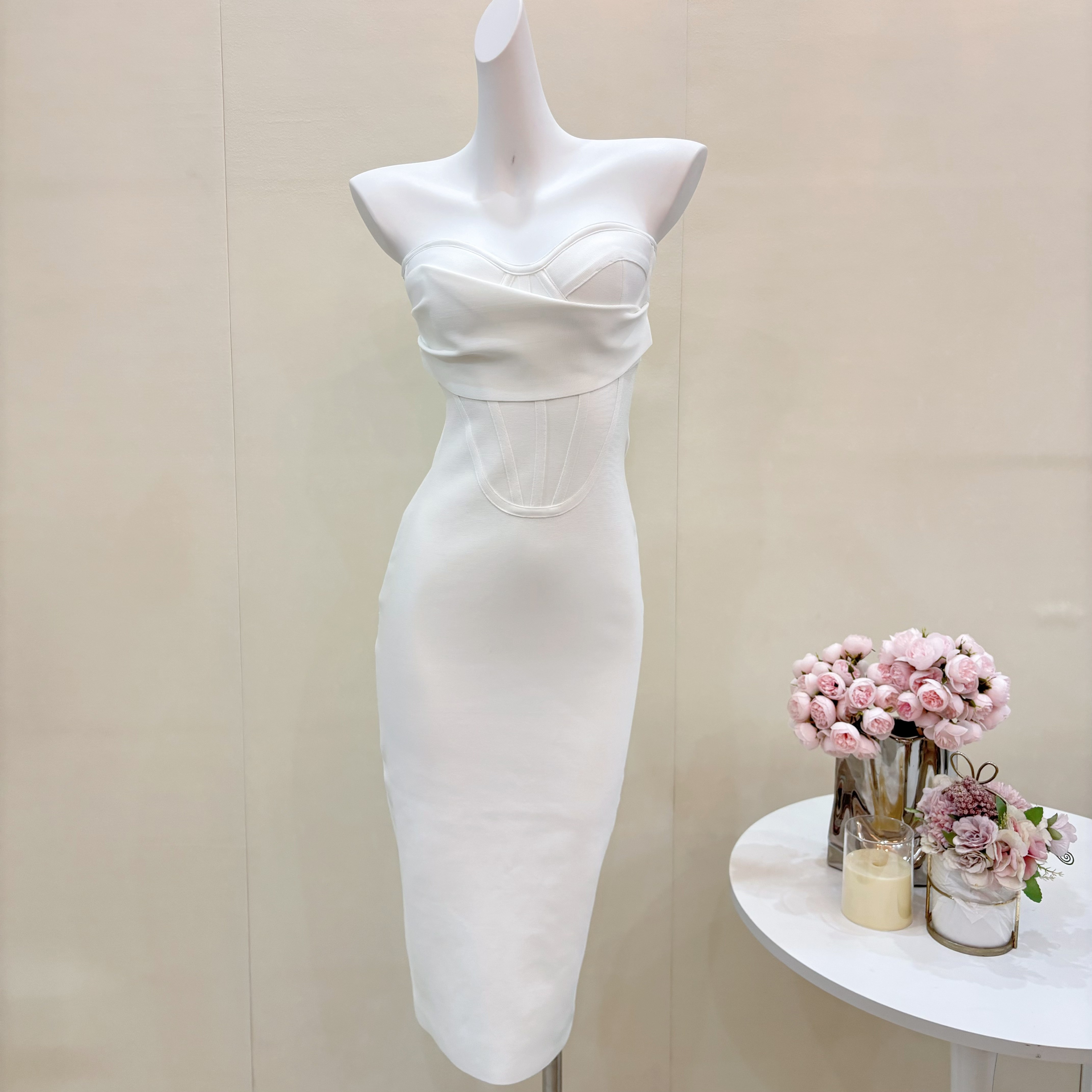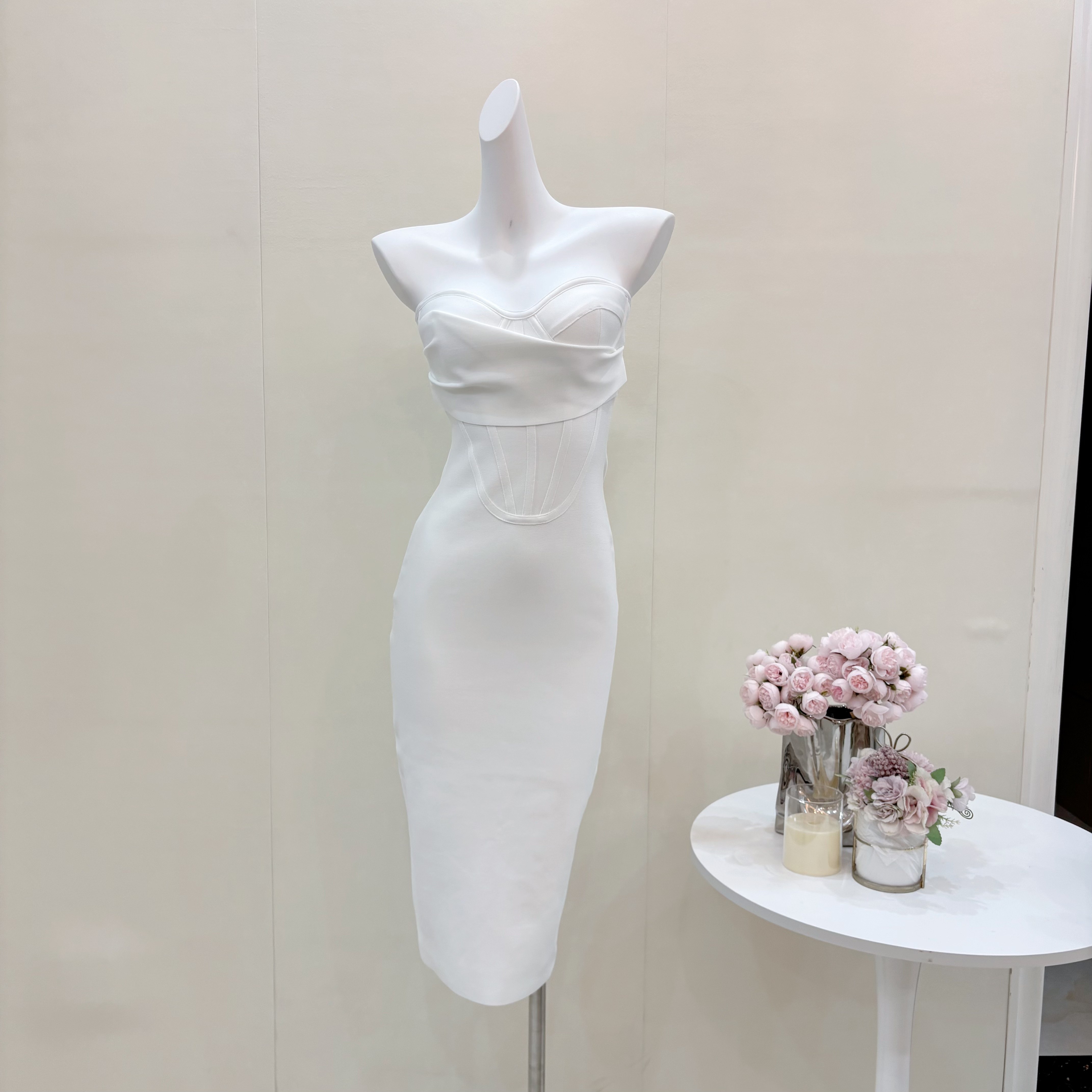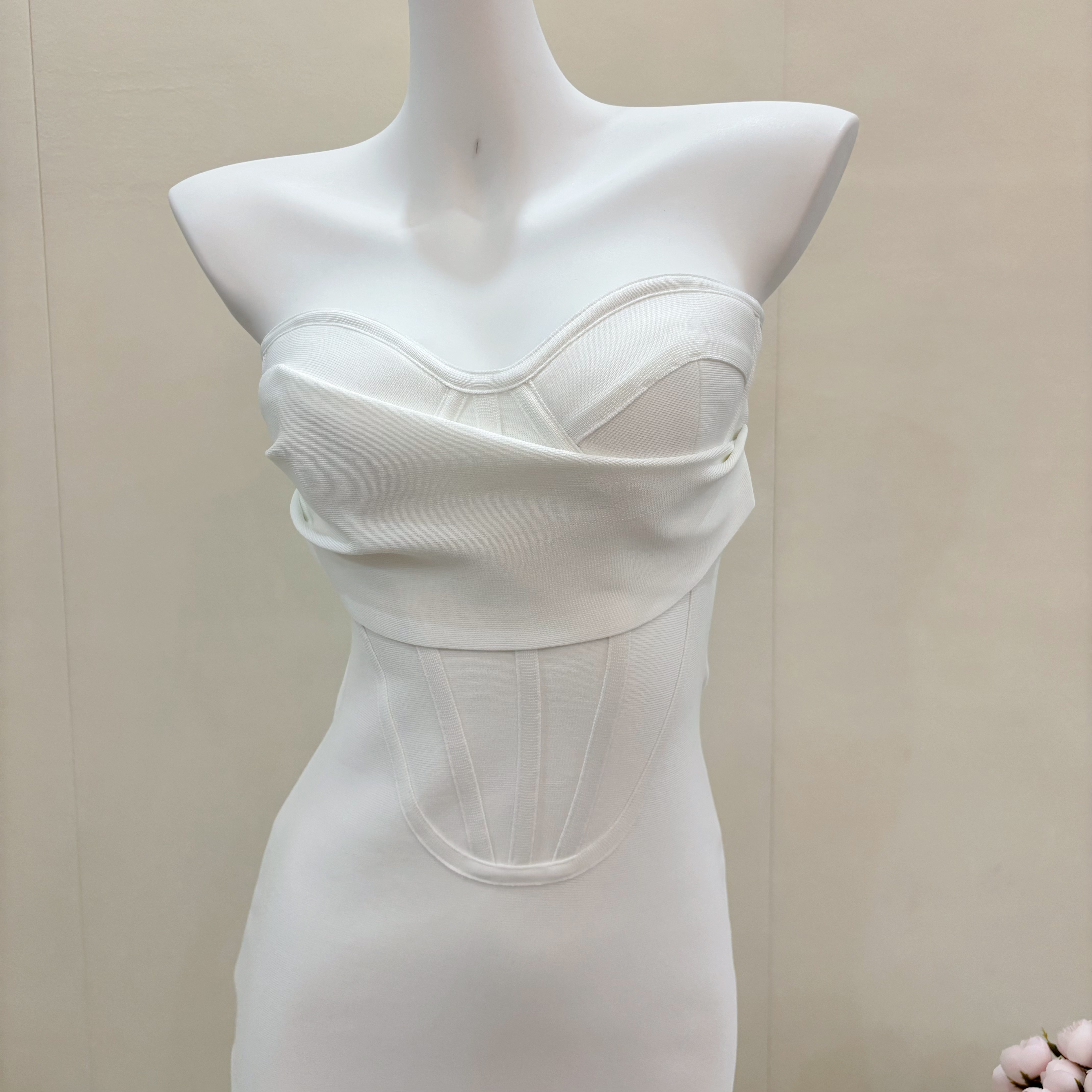 白色抹胸鱼骨束腰绷带连衣裙轻奢名媛性感宴会中长裙生日小礼服