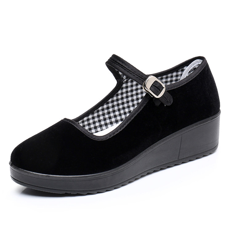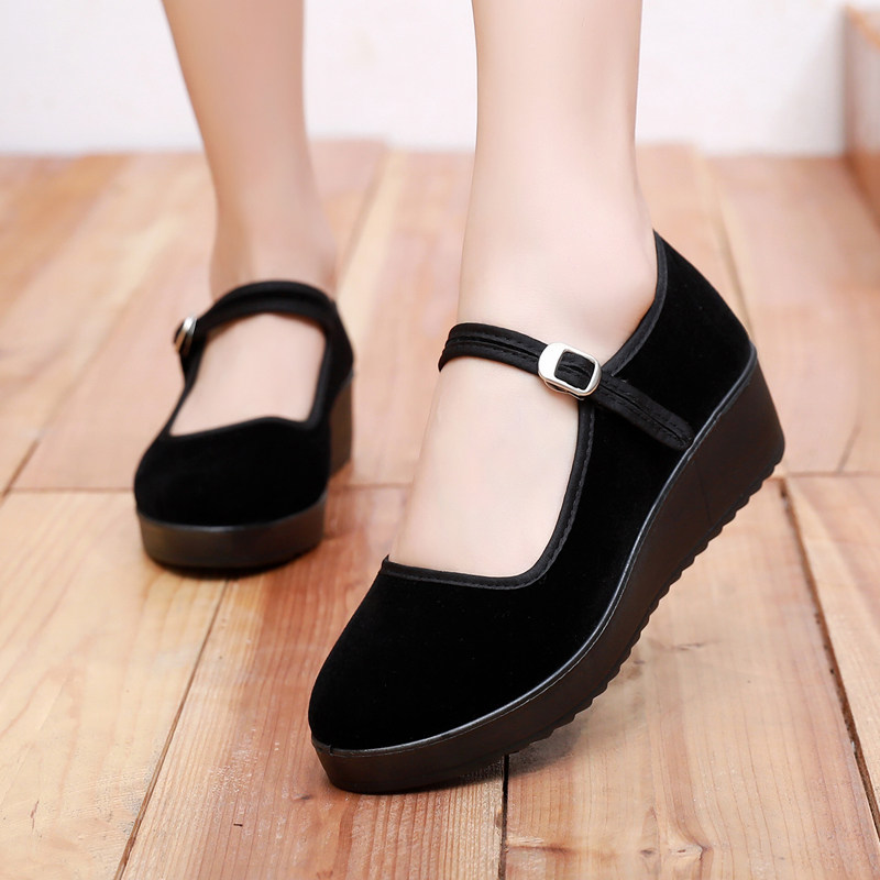 老北京布鞋女款夏季透气厚底防滑黑色绒面中年酒店上班工作礼仪鞋