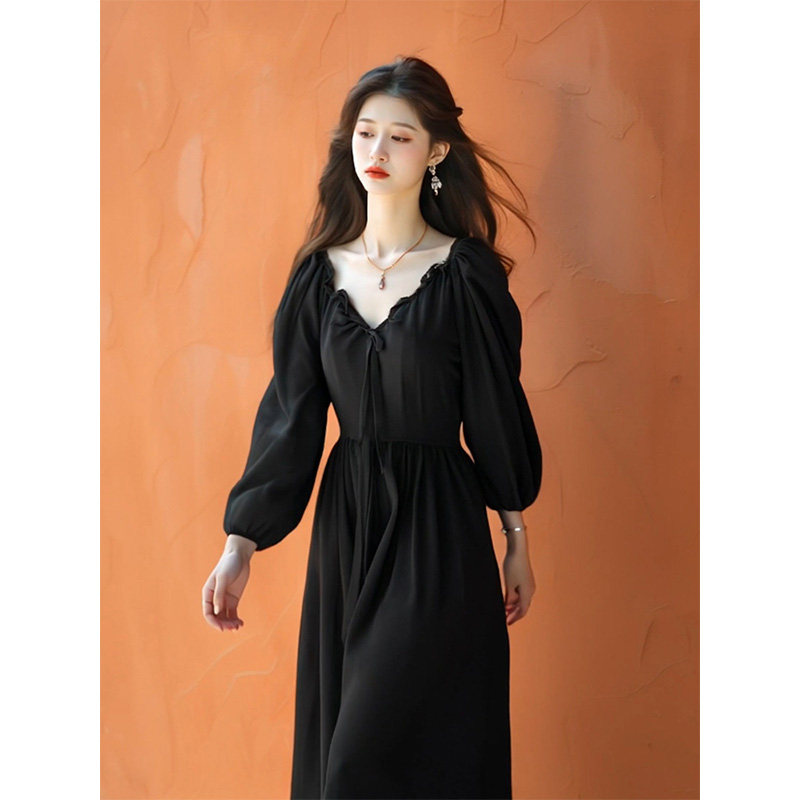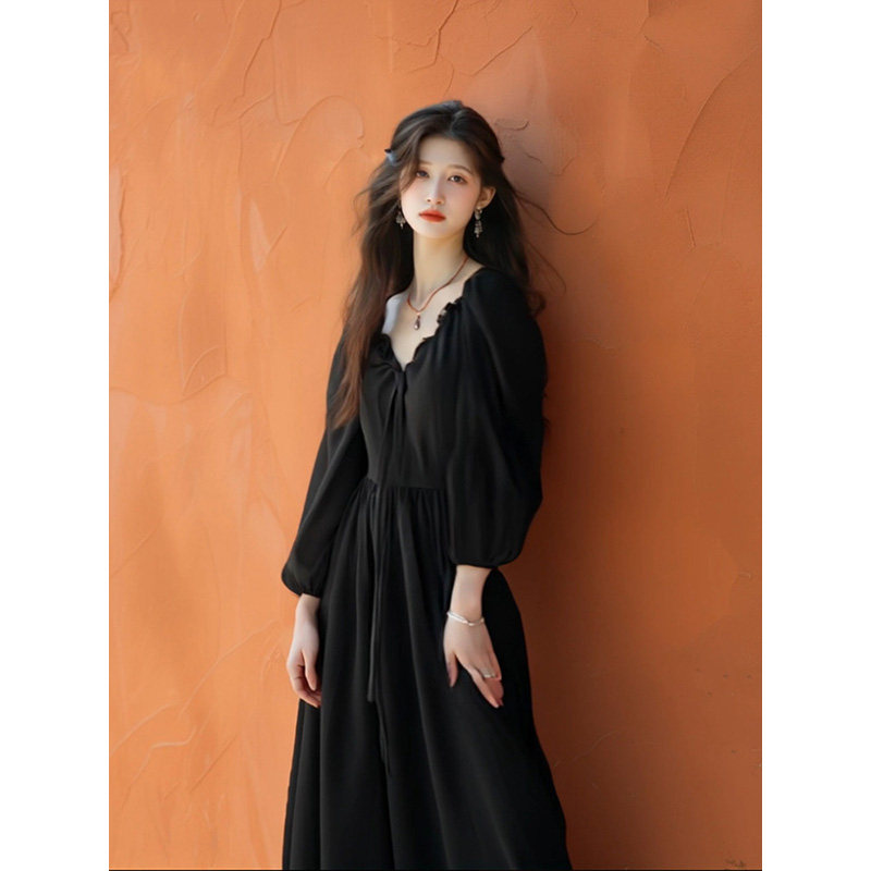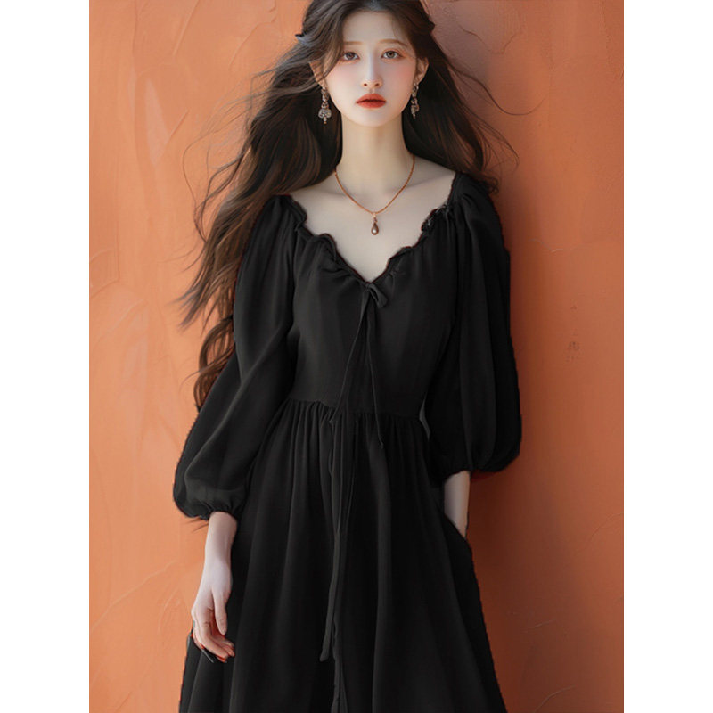 黑色V领连衣裙女2026年春季新款法式赫本风长袖收腰a字高级感裙子