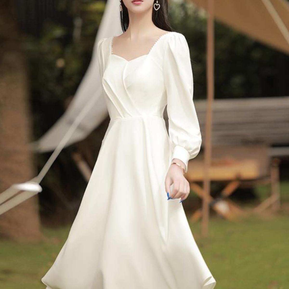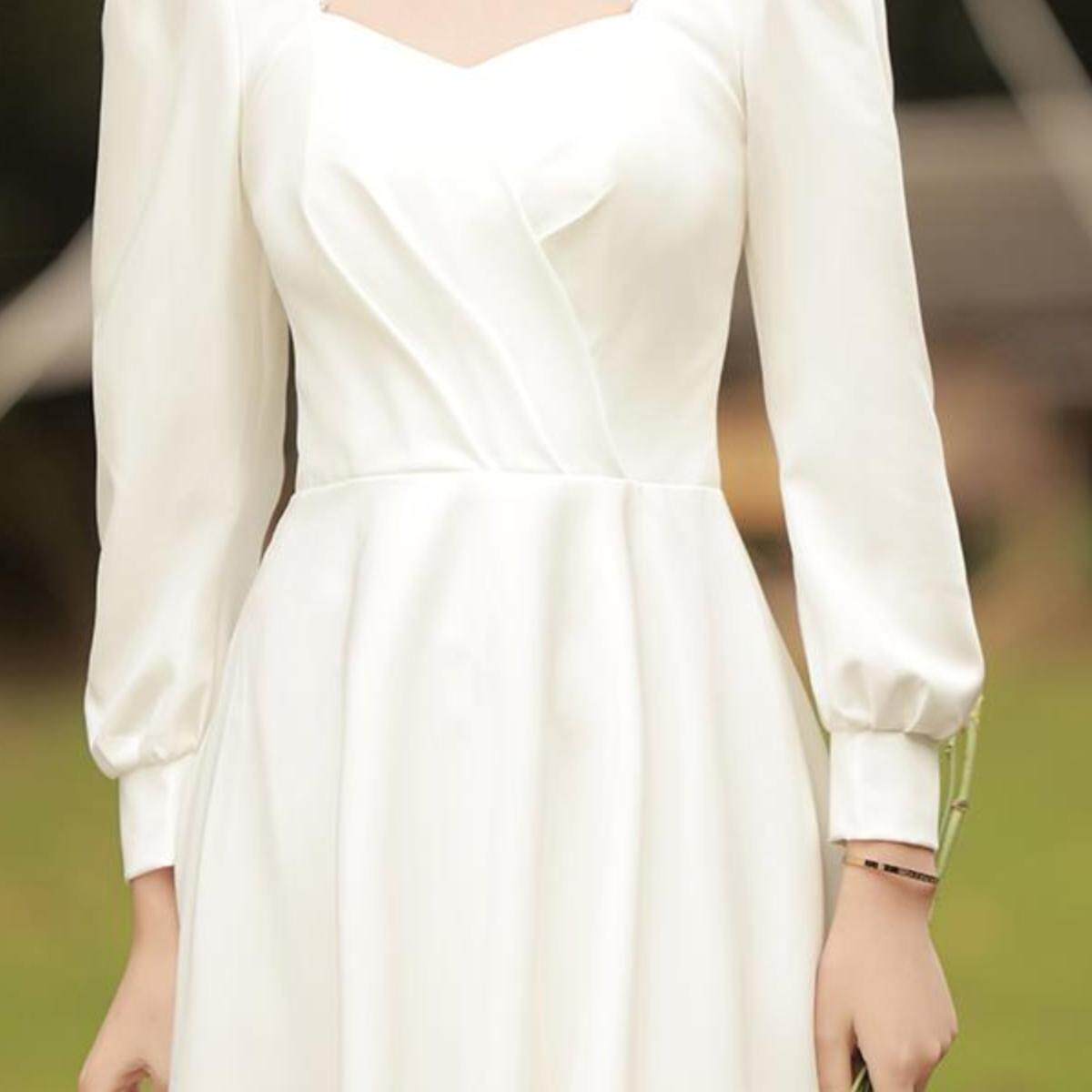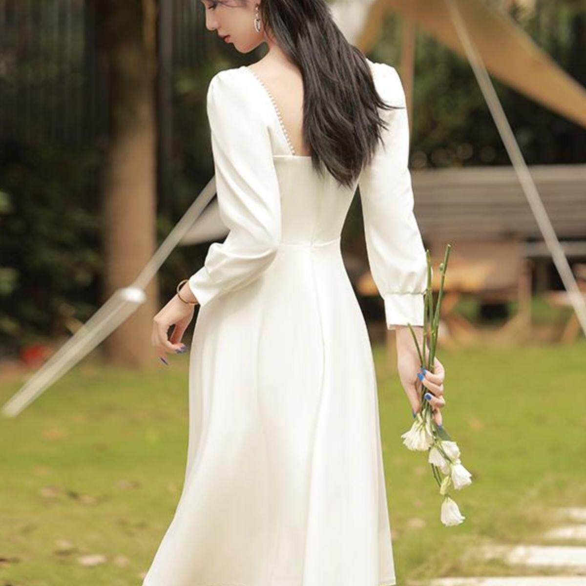 法式晚礼服白色气质订婚连衣裙平时可穿轻奢小众领证登记长袖冬季