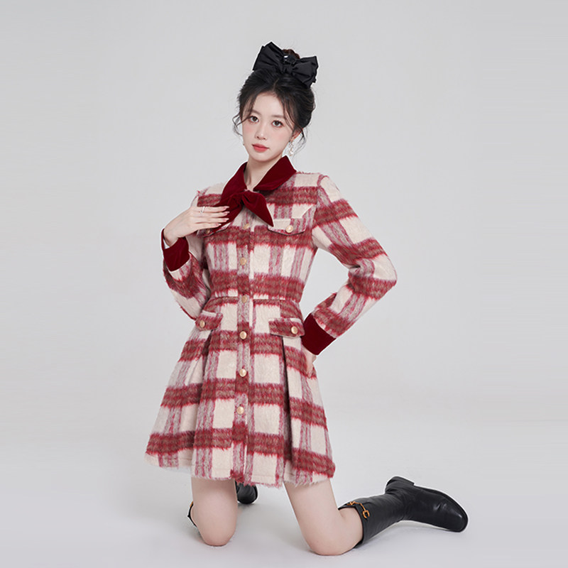 法式甜美红色格子长袖连衣裙女冬季气质加厚富家千金呢子新年裙子