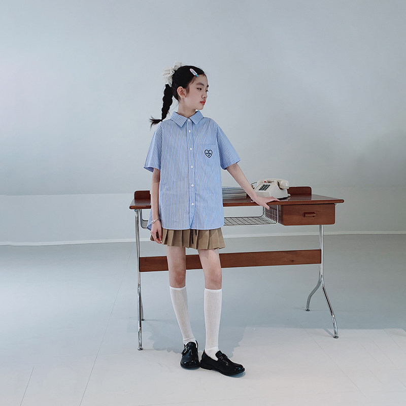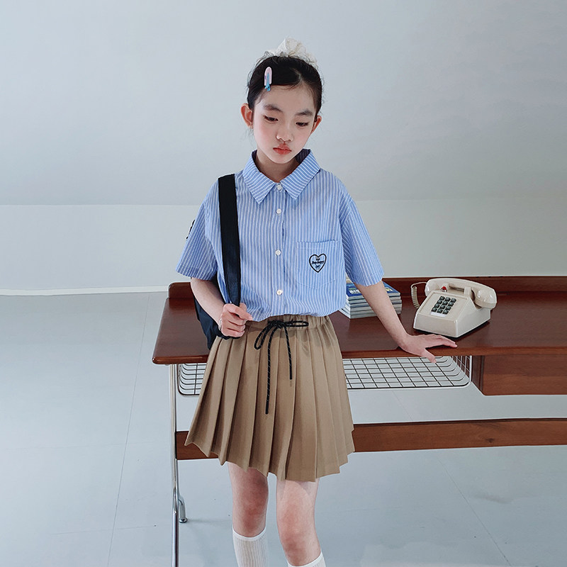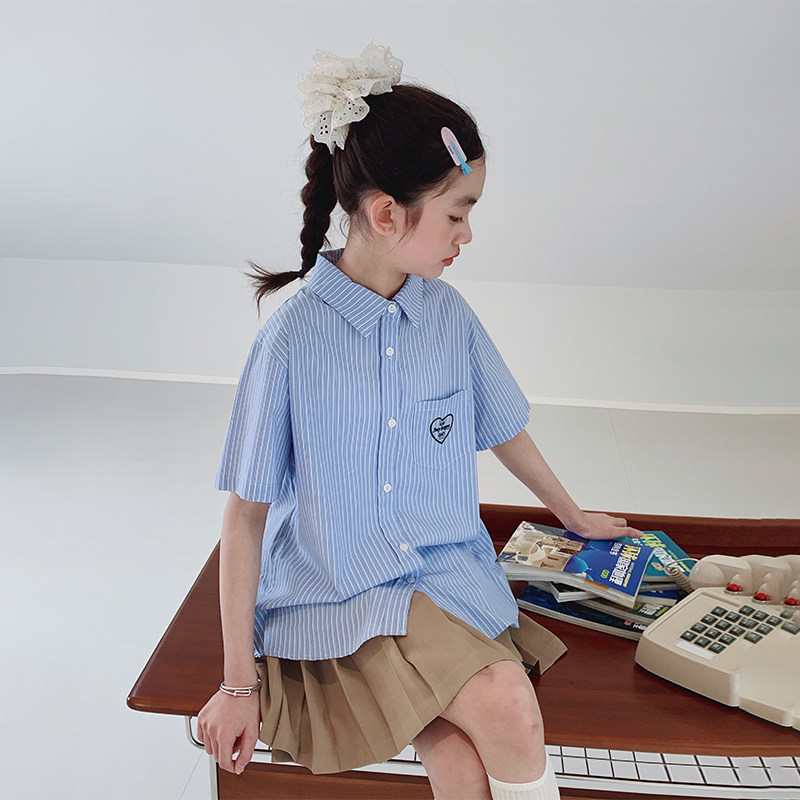 女大童短袖衬衫2026春装新款初中生条纹衬衣青少年学院风半袖上衣