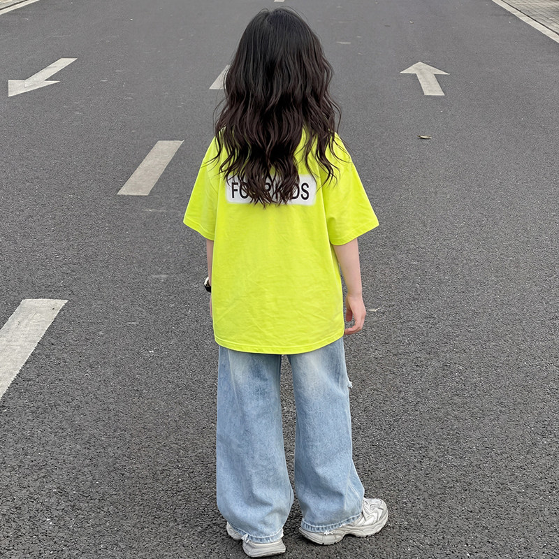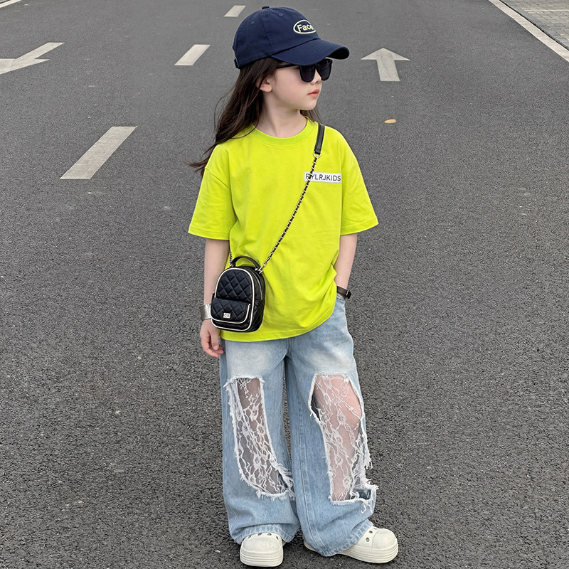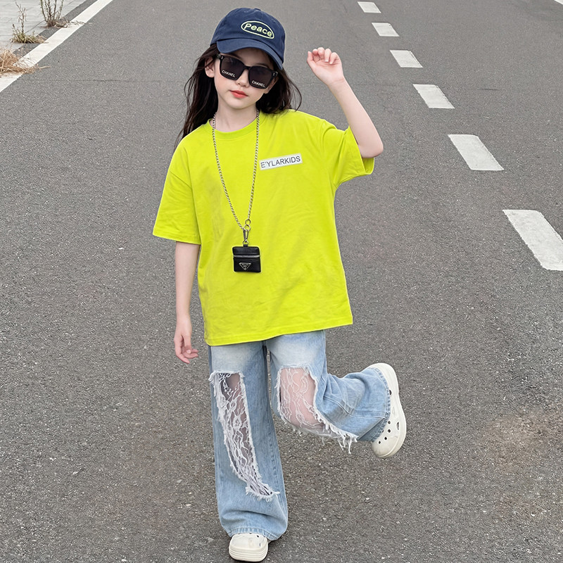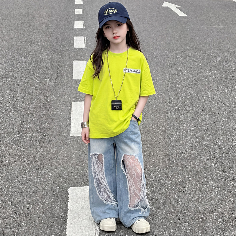 韩系荧光绿短袖T恤套装女童夏季新款潮酷儿童蕾丝破洞牛仔阔腿裤
