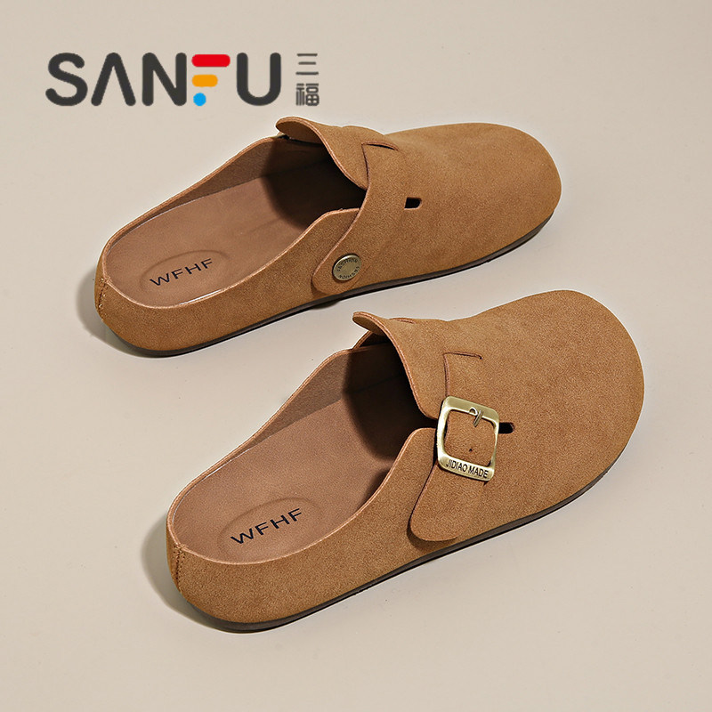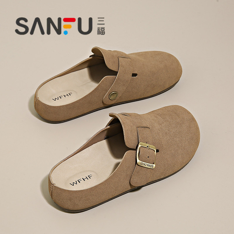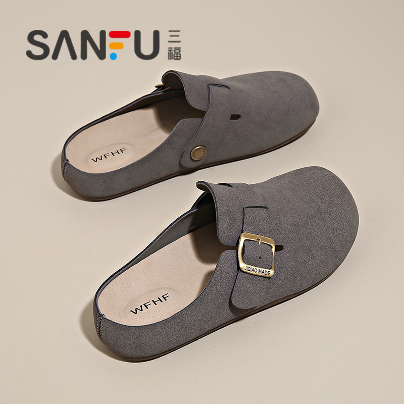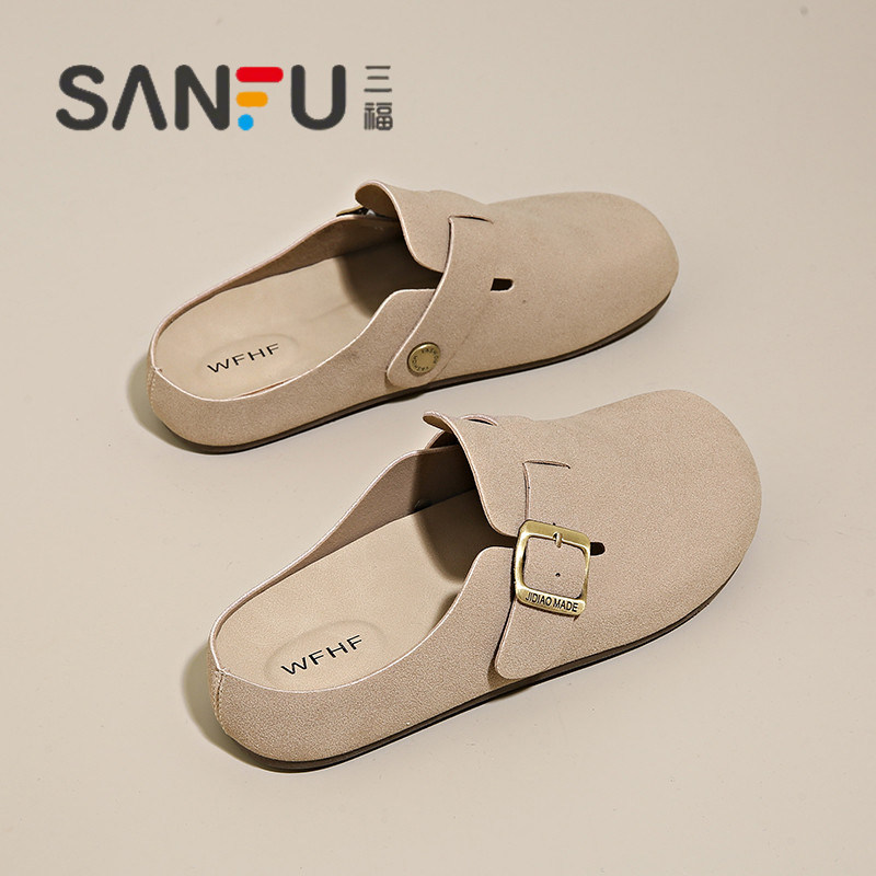 三福真皮勃肯鞋女2026新款春秋外穿懒人一脚蹬厚底百搭包头半拖鞋