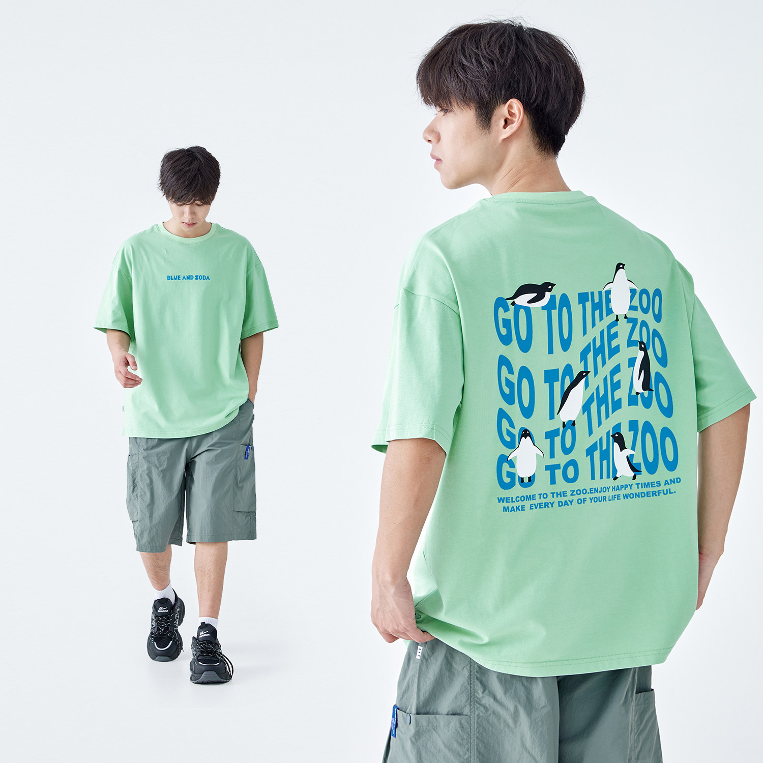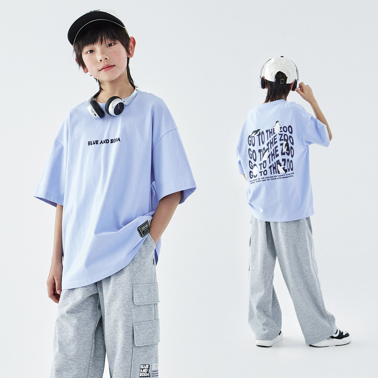 蓝汽水2026夏季新款男童全棉撞色短袖T恤青少年潮酷印花休闲上衣