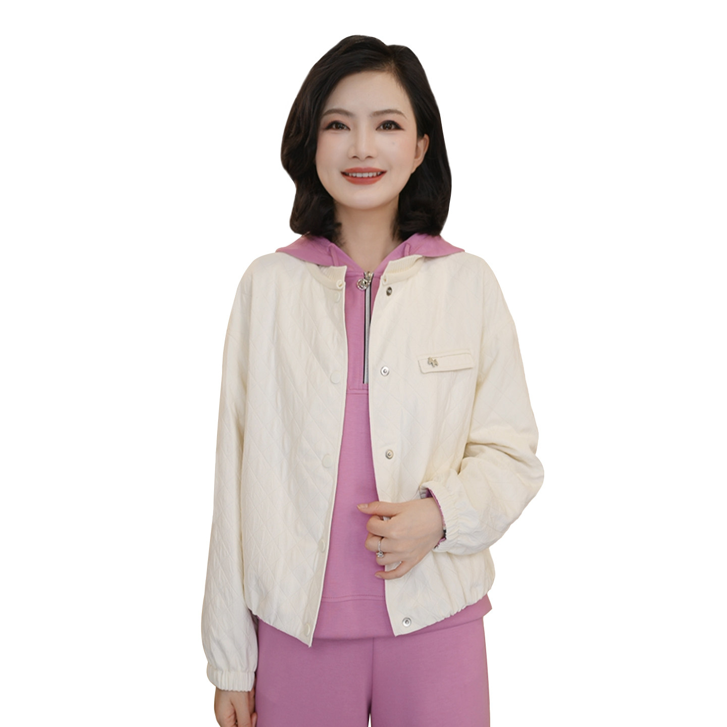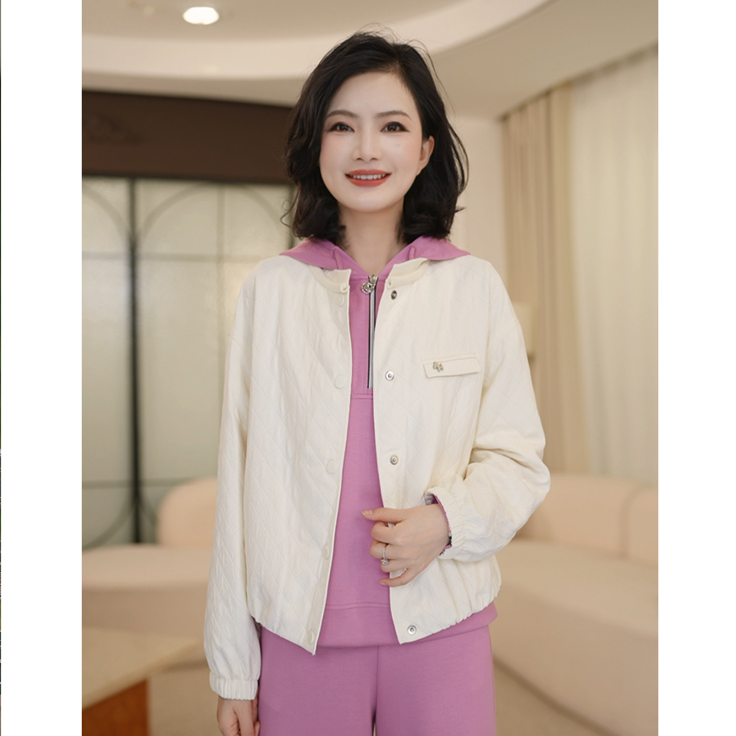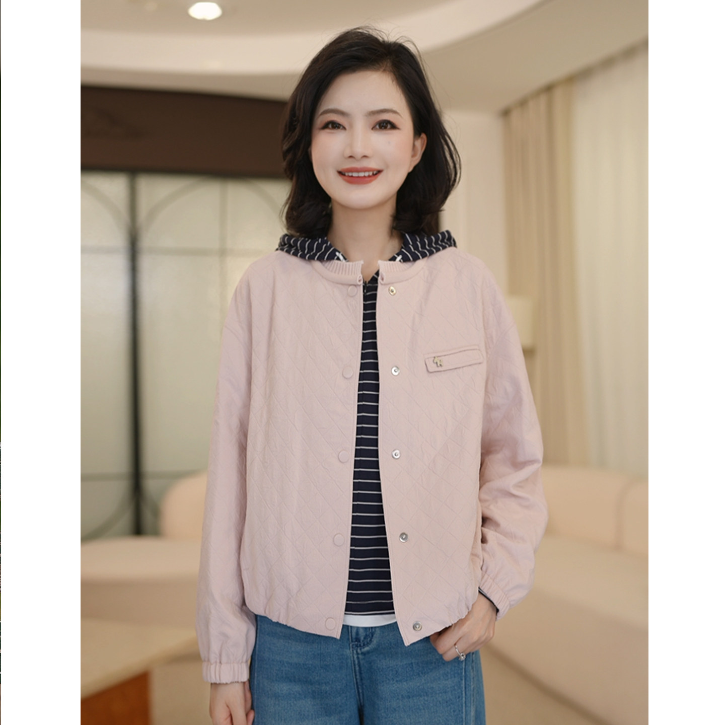 枫竺春款2026新款女装纯色菱格夹棉轻薄短款外套女休闲气质棒球服