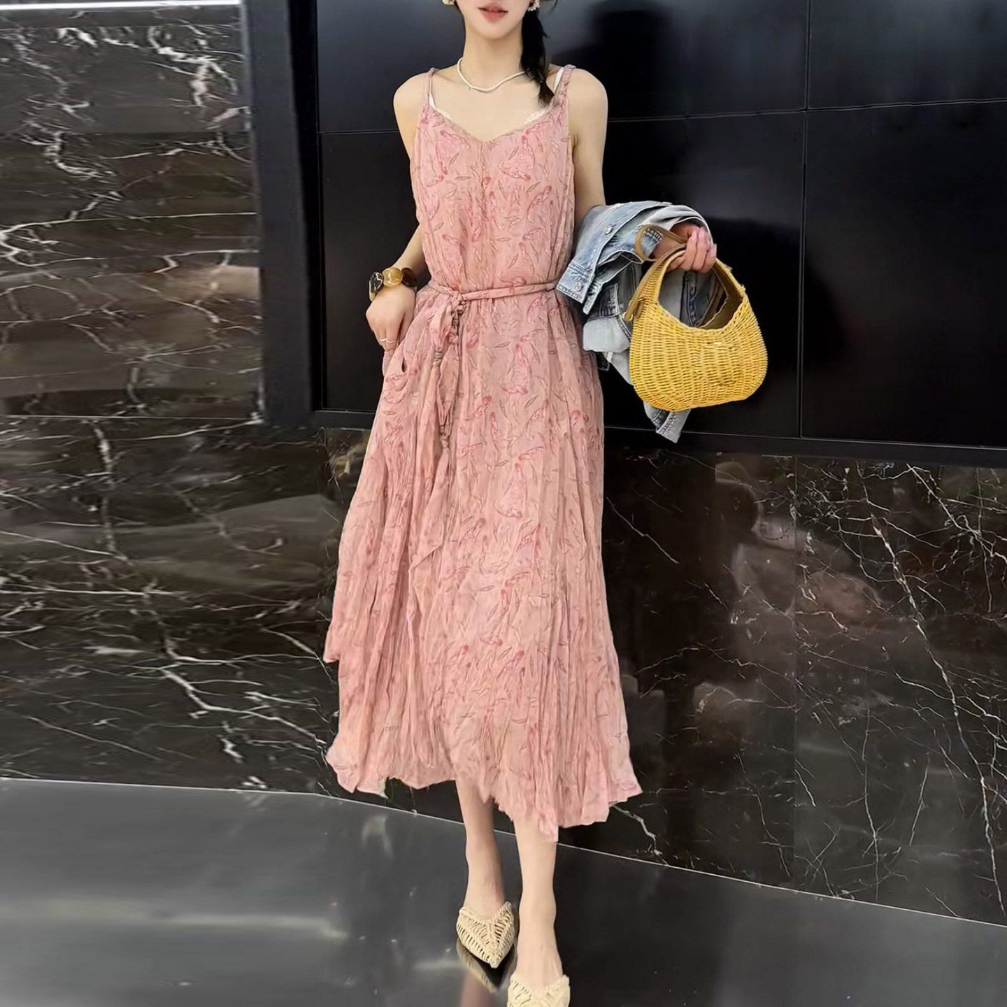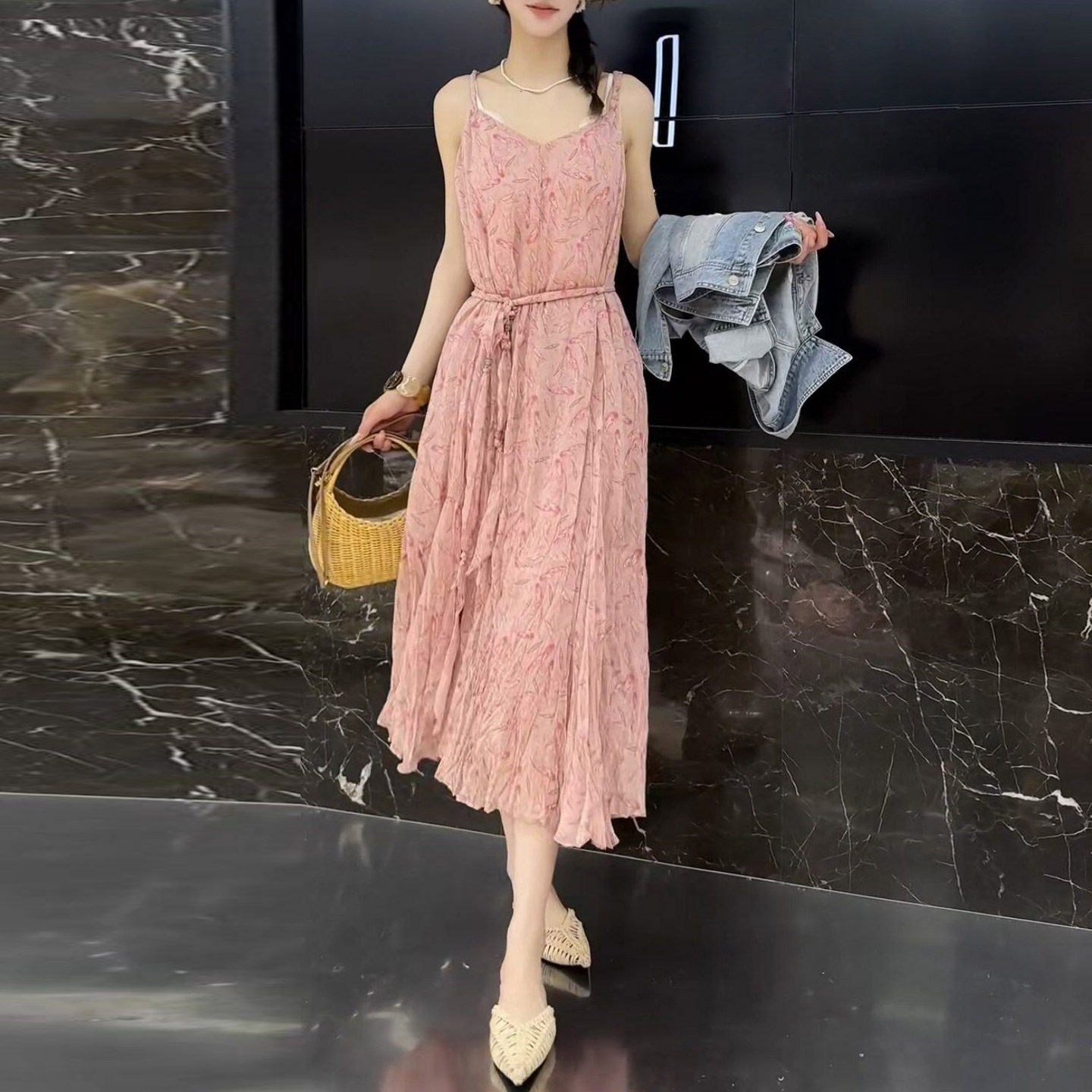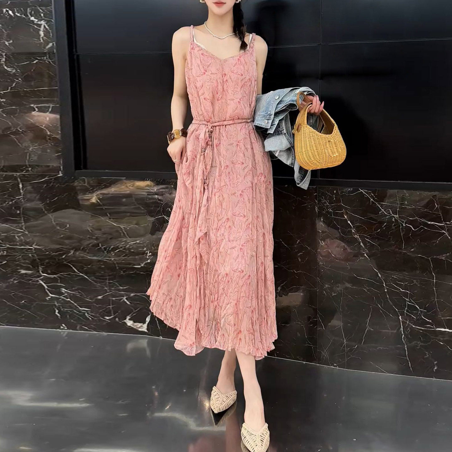 粉色裙子女装2026新款夏季长款优雅日常漂亮休闲碎花吊带连衣裙