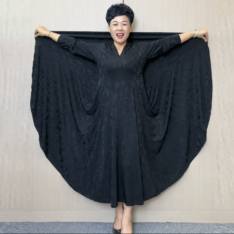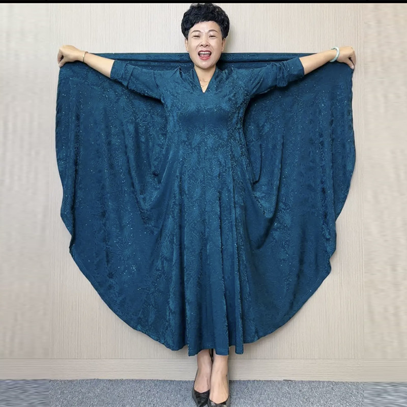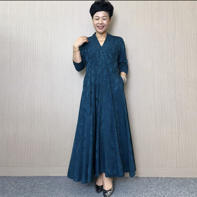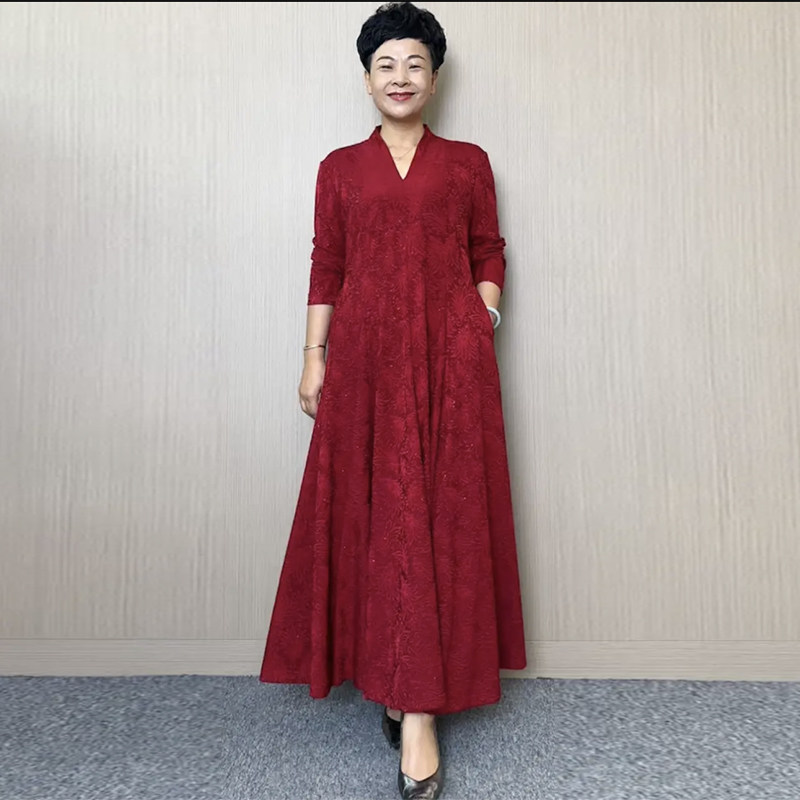 时尚大码连衣裙秋冬新款高档弹力坠感织锦提花大摆裙妈妈长款裙子