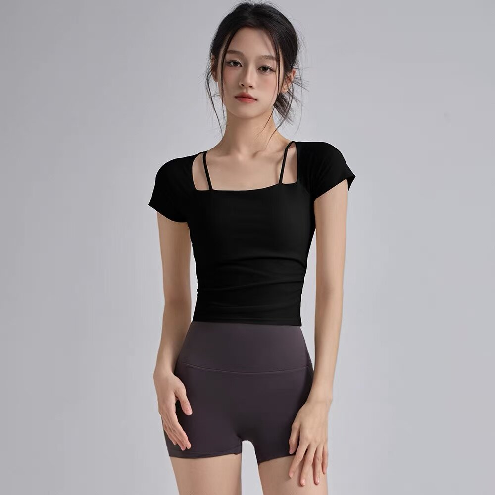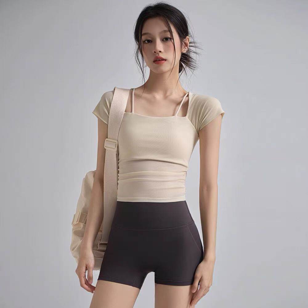 新款瑜伽服上衣女夏季绝美普拉提运动服套装健身衣短袖带胸垫