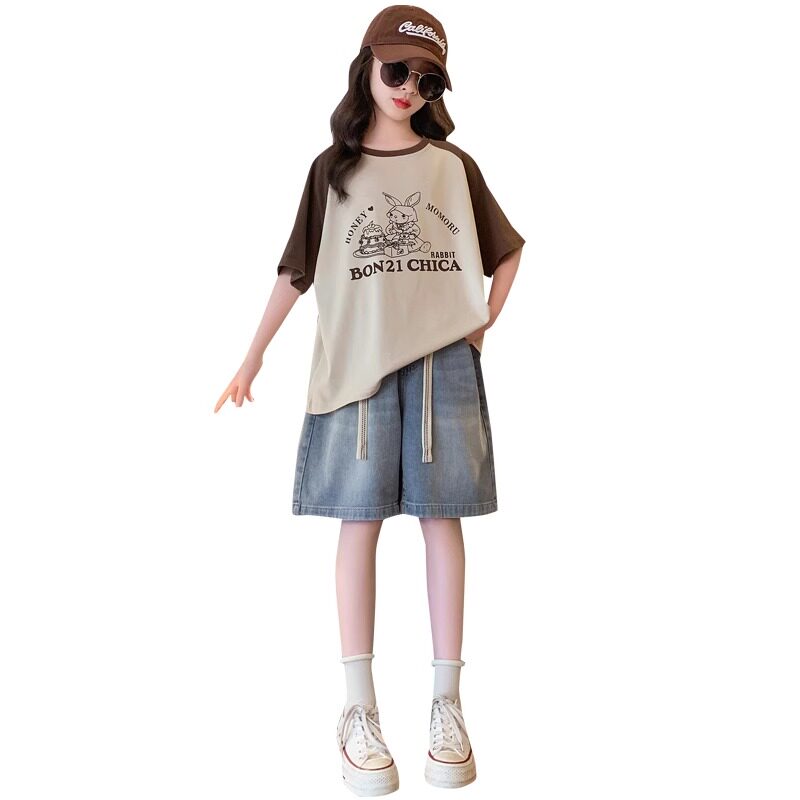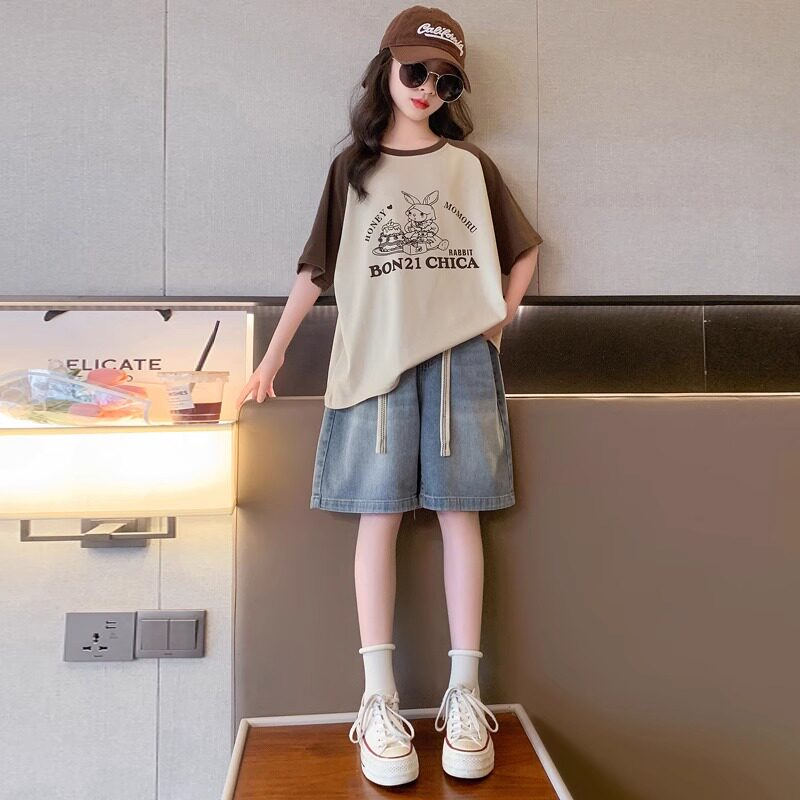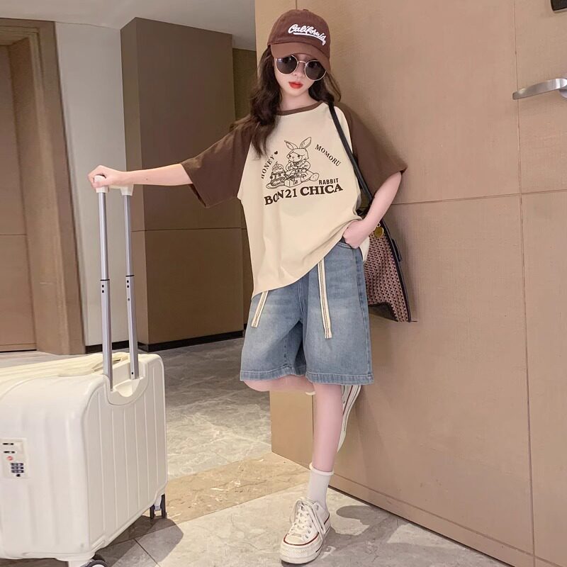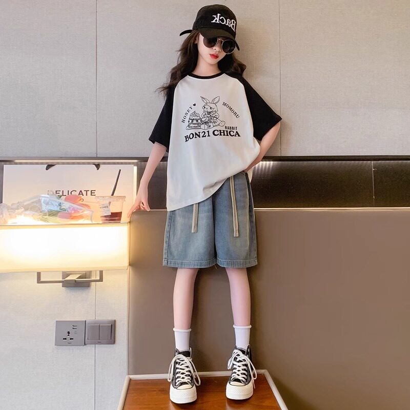 女童夏装套装2025新款洋气儿童牛仔短裤夏季薄款女孩天丝五分裤子